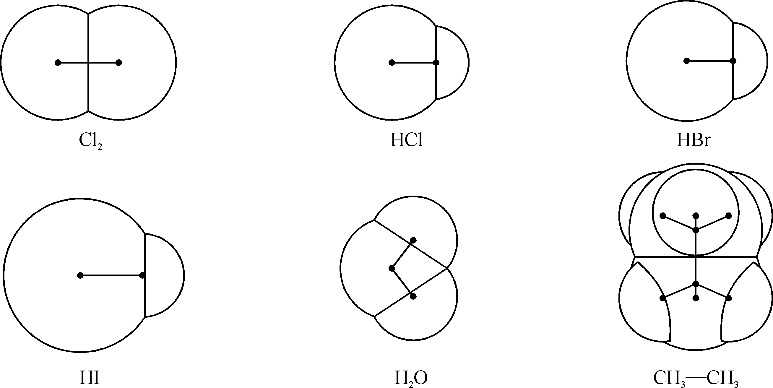 为了确定分子的形状,除了分子中原子的排列以外,我们还需要知道原子和分子的电子云有效边界. 当另一分子的电子云穿入这一边界时,分子之间就产生排斥力. 由于分子间力又叫范德瓦耳斯(van der Waals)力,往往把这一有效边界的半径叫作范德瓦耳斯半径. 我们从分子骨架中的每一个原子中心以相应的范德瓦耳斯半径作圆球,就可以确定分子的形状. 图1.8就是这样画成的几个简单分子. 在表1.7中列举了一些原子的范德瓦耳斯半径,这也是泡令所给出的.