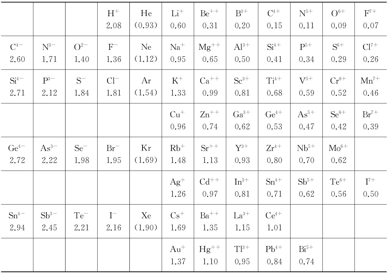 表1.4 离子的晶体半径 (单位为Å)