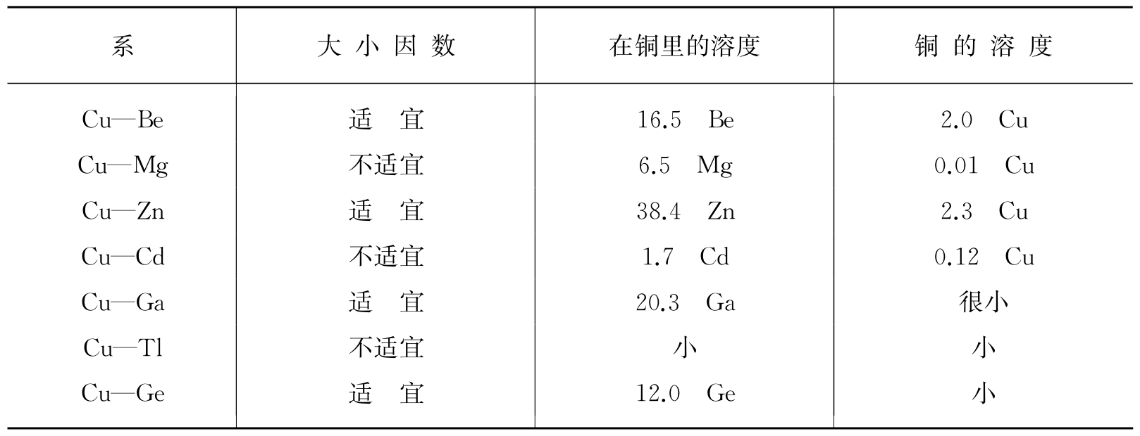 在前面几节中,我们曾经试图为分子和原子引入一个具体的和写实的图像. 我们的目的是为宏观性质的讨论奠基,因为分子和原子是一切物质的微观组成. 单单分子和原子具有一定大小与形状这个概念本身就往往对很重要的工程问题给出有用的启发. 作为第一个例子,可以举出形成置换齐时所遵循的关于原子大小的规律,这曾由休姆·罗瑟里(Hume-Rothery)等写成公式. 置换齐是两种金属的合金,其中基本元素的某些晶格点座为齐化元素的原子占有. 显然由纯几何学的考虑就可以作出结论:两类原子的大小不能有很大的差别;否则在进行置换时不能不严重地扰动晶格结构,也就是只能形成局部齐化. 实际上,上面提及的研究工作者发现原子半径的差别大于15%时就不能形成任何成分的固溶体. 这一半径是指表1.1、1.2和1.3所列举的金属半径. 在表1.8中,把不同金属在铜中的溶解度以及铜在这些金属中的溶解度和原子半径作了比较. 按照这一规律,Ag—Au体系应该是高溶度的一个最好的例证. 因为两种组分都是面心立方晶格,原子价相同,而原子半径仅相差2%. 这一结论由事实证实了:Ag—Au体系形成遍及全部组分的单相置换齐.