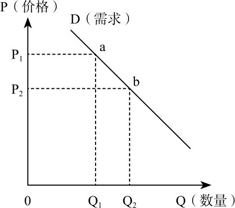 关于需求定理,可以用一幅非常简单的图来呈现(见图2-2)。横轴是数量,纵轴是价格。由原点往右,数量增加;由原点往上,价格增加。在这幅图上,有一条负斜率的线,由左上方延伸到右下方,这条线可以称为“需求线”(或“需求曲线”)。而价量的反向变动关系,就反映在这条线的负斜率上:价格高,需求量低;价格低,需求量高。