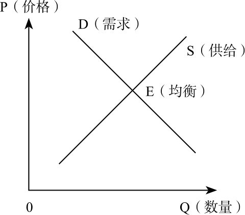现在,可以把上一节的需求和这一节的供给放在同一幅图上(见图2-4)。一条线是正斜率,另一条线是负斜率,这两条线刚好像一把剪刀,有一个相交点。在这个相交点上,供给量刚好等于需求量,市场就达到均衡。在这个相交点的上方,供给量大于需求量,即“供过于求”。一旦市场里的某个商品“供过于求”,出现滞销,市场的供给方就有意愿降低价格,以吸引消费者。在这个相交点的下方,需求量大于供给量,即市场里的“供不应求”,有人想买而买不到,价格就有上升的趋势。