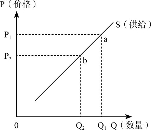 在图2-3中,横轴是数量,纵轴是价格;在右上方的第一象限里,供给线是一条正斜率的线;由左下方开始,向右上方延伸。因为是二维的平面,所以供给线的图形也反映了“其他条件不变”的特质。如果其他条件改变,这条线的位置会相应移动。譬如,您不妨想一想,如果风调雨顺,今年的核桃丰收,那么,和去年相比,今年核桃的供给线,是往右还是往左(平行)移动?