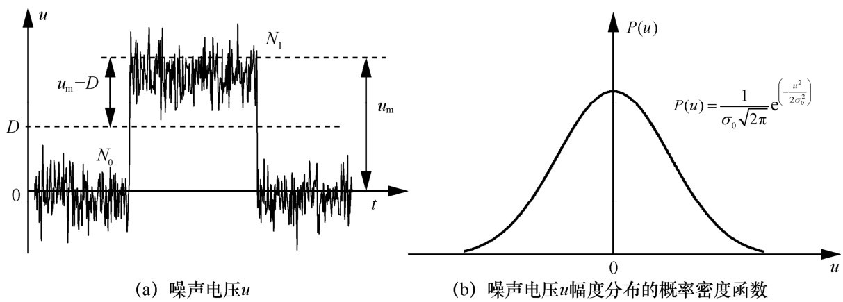假定总噪声的概率分布为高斯分布,则大大简化了计算。假设在接收机判决点上“1”信号的幅度为 u m ,判决点门限(阈值)为 D , N 1 和 N 0 分别为码元为“1”和“0”时的噪声平均功率。判决点上的噪声电压 u 如图2-6(a)所示,噪声电压 u 幅度分布的概率密度函数如图2-6(b)所示。