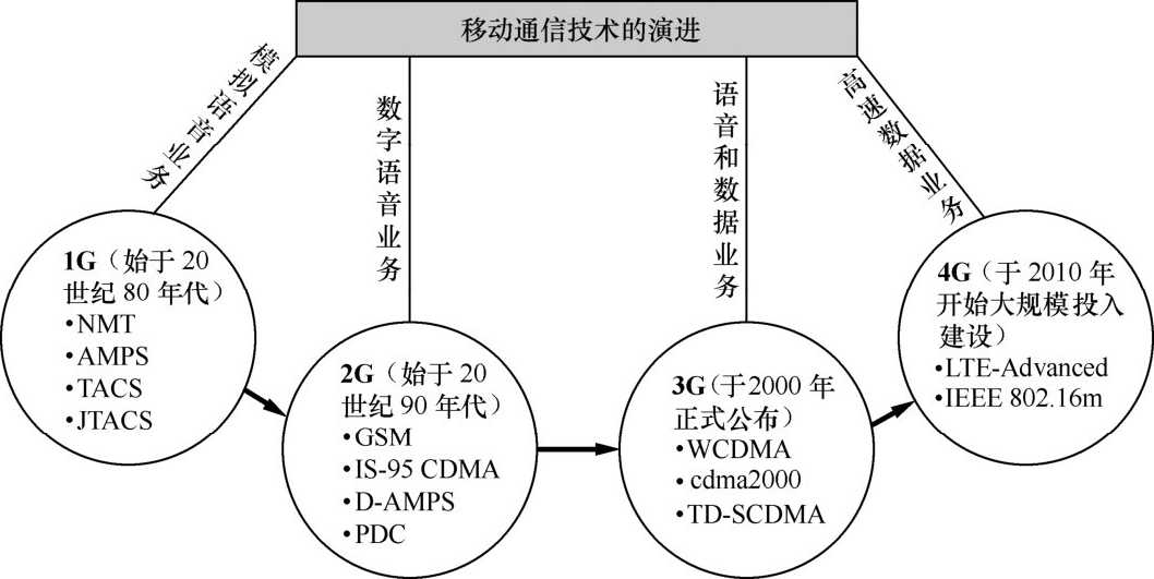 在本书的开篇,我们先简要回顾前四代移动通信技术的发展历史,以更好地展望5G和6G的未来趋势。图1-1展示了前四代移动通信技术的演进脉络。