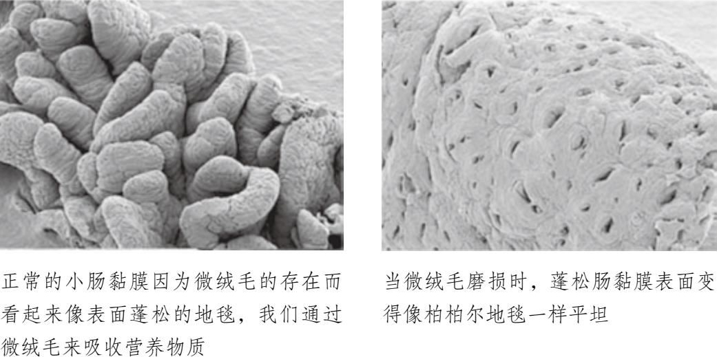 乳糜泻是目前研究最多的自身免疫性疾病,也是唯一一种确定了环境诱因(小麦、黑麦或大麦中的麸质)的疾病。它是一种由麸质引起的慢性自身免疫反应,产生的自身抗体会攻击肠道和其他组织。肠道长6~7.5米,小肠黏膜表面附有微绒毛,这使肠壁看起来就像表面蓬松的地毯,微绒毛可以吸收营养物质;当这些微绒毛因为暴露于麸质中而产生磨损时,就会发生乳糜泻,肠道内表面变得像柏柏尔地毯(一种表面平坦的厚型毛毯)一样平坦,导致肠道不能很好地吸收营养(图1-3)。不管你实际摄入了多少营养物质,最终都会导致营养不良。乳糜泻患者经常感到恶心、疲倦和沮丧,也可能会饱受脑雾的困扰。芝加哥大学乳糜泻研究中心的科学家已经发现了超过300种与麸质敏感相关的症状和病症。在第四章中,你将接受一个简单的测试来确定你的症状是否与乳糜泻或非乳糜泻性麸质敏感有关。