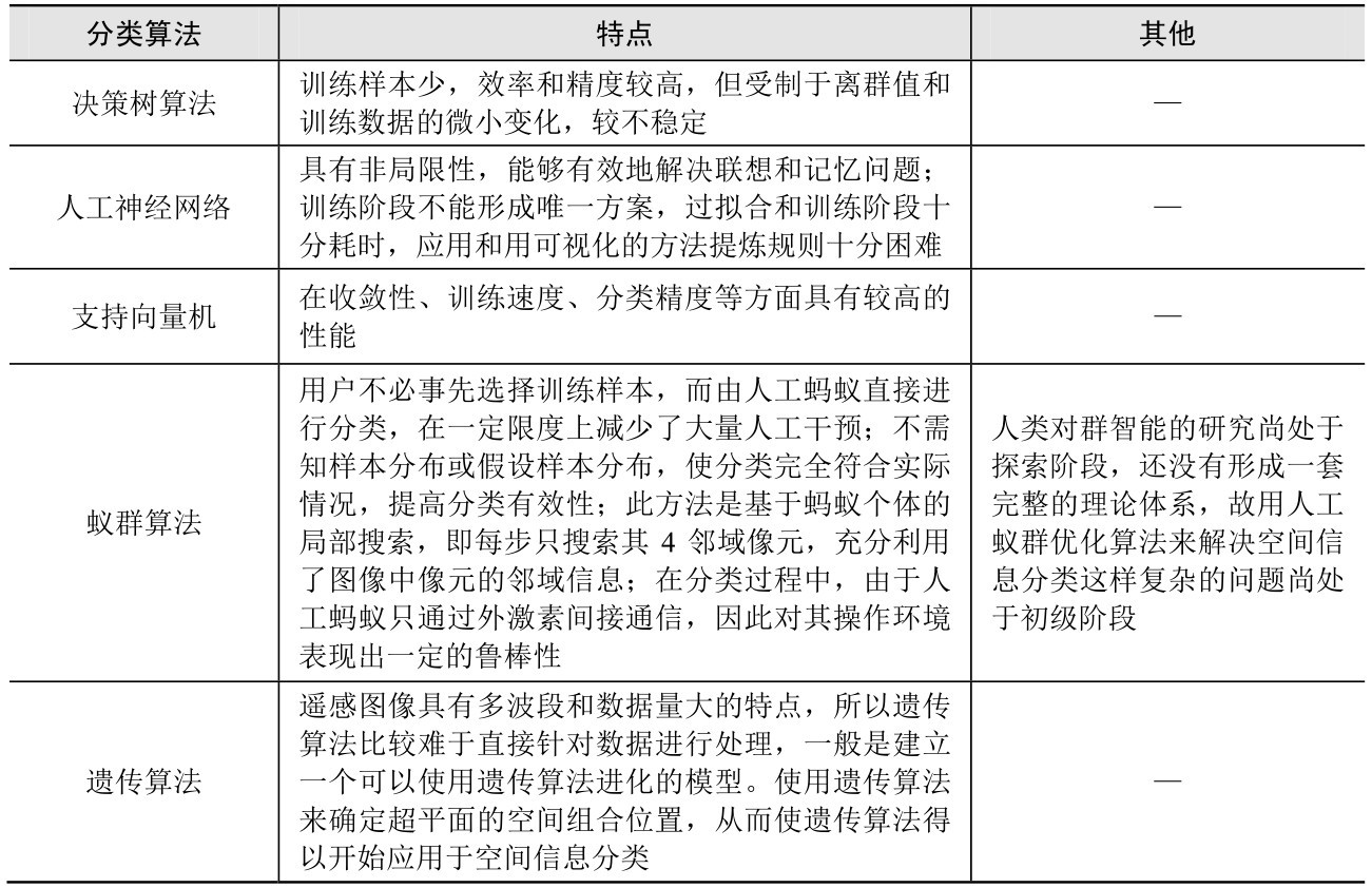 空间信息处理方法复杂,手段烦琐,信息量大,数据维度复杂,因此人工读取相对困难。如果能将人工智能用于空间信息处理,利用机器自动进行识别,势必会是空间信息领域一个巨大的突破。近年来,随着学科交叉融合现象的普及,人工智能和空间信息有了一定的融合交叉研究,在遥感图像智能分类、智能处理,无人机遥感获取图像信息等领域取得了一定的成就。许多国内外企业和研究机构致力于利用人工智能代替人类处理大量的空间信息,从而提高空间信息利用率和处理效率。目前,无人机遥感、机器人探测乃至利用人工智能进行图像识别、图像分类和图像处理,成为研究者的关注点,基于决策树算法、人工神经网络、支持向量机、蚁群算法、遗传算法等适用于空间信息处理的智能方法,以及基于目标检测、场景分类、语义分割、变化检测的智能遥感卫星在轨处理算法等逐渐被专家开发出来并投入使用。表1-1给出了常见空间信息智能处理算法及其特点。