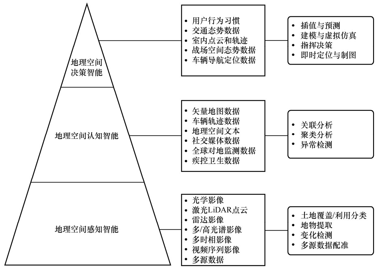 空间智能技术作为传统地理信息技术在智能化方向的重要拓展,不仅促进传统地理信息产业的转型升级,也在开拓新的智能化应用领域。地理空间智能的研究进展可以分为地理空间感知(Perception)智能、地理空间认知(Cognition)智能及地理空间决策(Decision)智能3个方面,三者层层递进(如图1-1所示)。