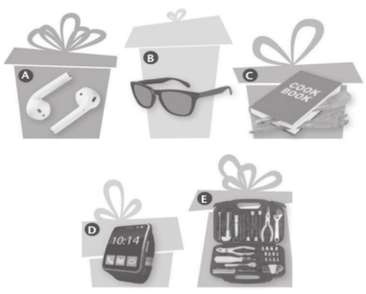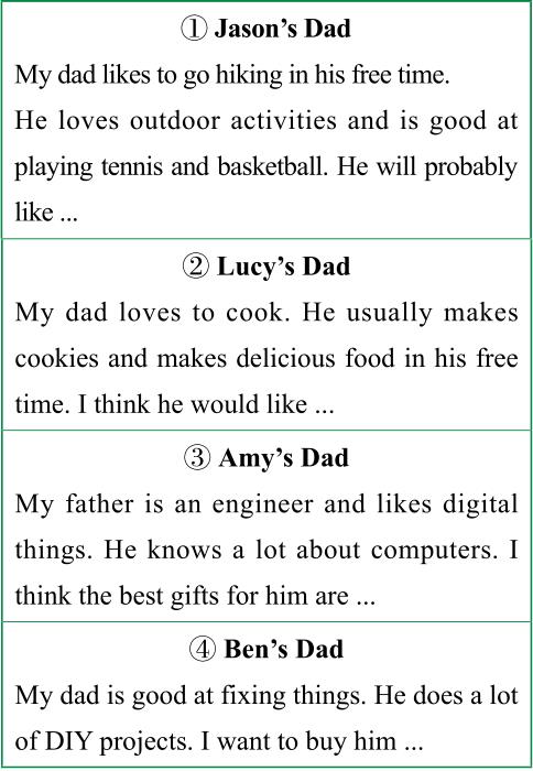 5. 根据Jason、Lucy、Amy和Ben对自己父亲的描述,选出他们可能会送给自己父亲的礼物。