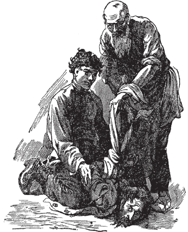 这时,人们对我推推搡搡,拉拉扯扯,盘问了好长时间。最后,那个花白头发的水手终于来了,他把我抱起来,对大家解释说: