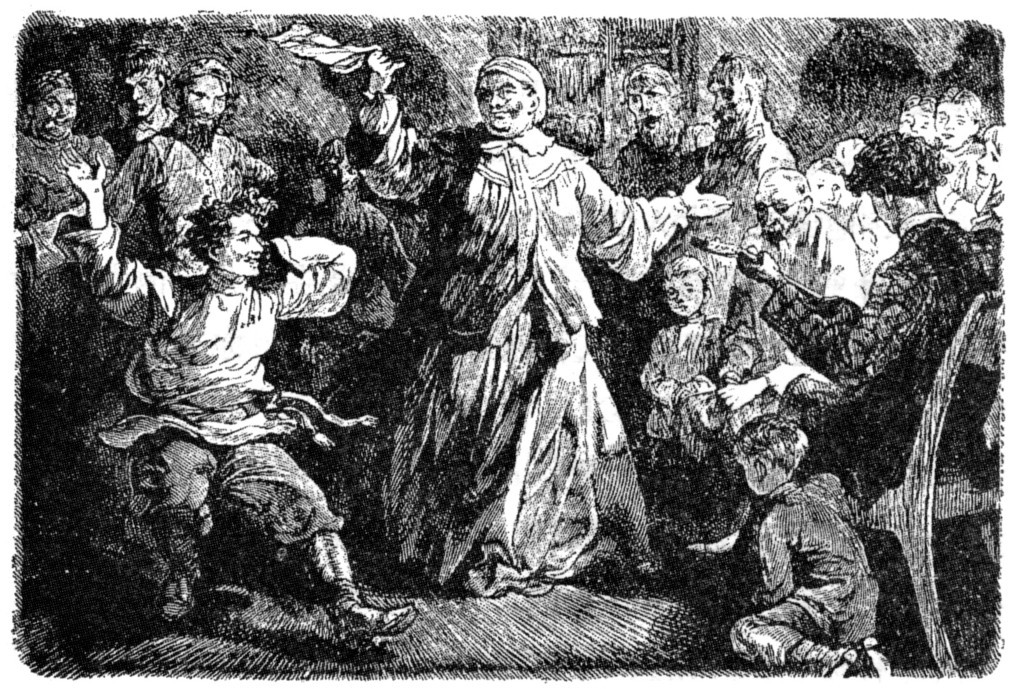 人们先是大吃大喝,只听见呼哧呼哧的喘气声,然后给孩子们分发节日礼物,再给每人一小杯甜果子酒,接着,热闹而又奇特的娱乐活动就渐渐开始了。