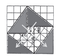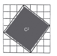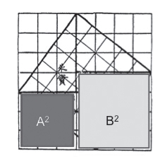 这或许反映了纯粹数学与应用数学之间长久以来的紧张关系,许多工程师其实是数学天才,但数学天才并不一定就得当职业数学家,而且把当时的人称为数学家似乎有点牵强。遵照希伯特的教诲,我们不妨想象当时有位杰出的行政官员,他白天的工作是测量田地或建筑用地,并用泥板记录相关的平面图。这些几何图形或许激发了他的想象力,于是他开始探索这些图形如何界定长度和面积(人们可能会想到在瑞士专利局上班的爱因斯坦)。然而,毕氏法则是如何被发现的呢?这是真正的谜团。霍伊鲁普在《长、宽、面:古巴比伦代数及其相关知识》( Length,Width,Surfaces: A Portrait of Old Babylonian Algebra and Its Kin )一书中分析泥板Db 2 146 [1] 时主张,巴比伦人发现了中国西汉著名弦图的某一个版本(讨论见后)。这张弦图的关键是在一正方形内作一内接正方形,使其四角所余三角形都与给定的三角形相等。可惜的是,在泥板里找不到任何类似的图形,然而泥板BM 15285(见图4)上可以看到转成45°的内接正方形。一旦画出这种图形,就有许多方法可用于证明毕氏法则。霍伊鲁普仔细分析泥板Db 2 146的语句之后,在书中画出了一个类似弦图的图示(参见该书第259页,图67)。图5是我最偏爱的一个版本,其中A、B、C表示三个正方形的边长,也即白色三角形的三边的长。