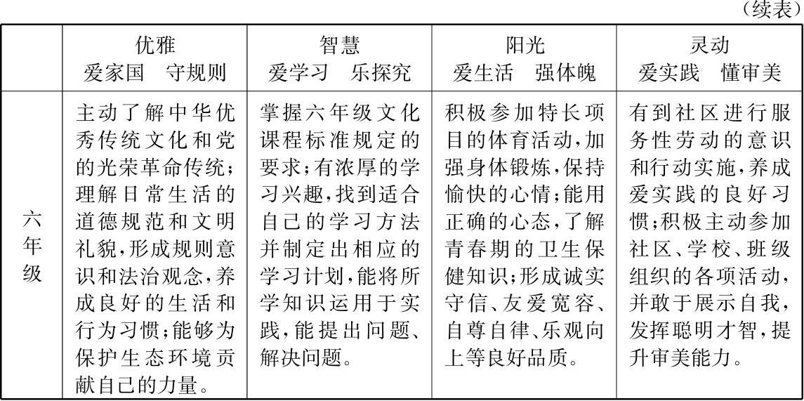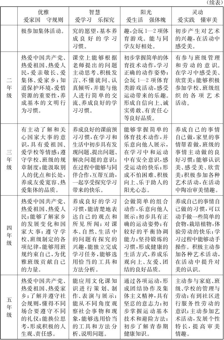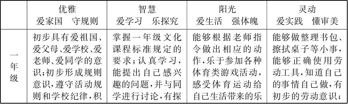 基于以上育人目标,我们根据各年级学生的年龄和身心特点,将育人目标进行细化,形成了一—六年级的分年级课程目标(见表1)。