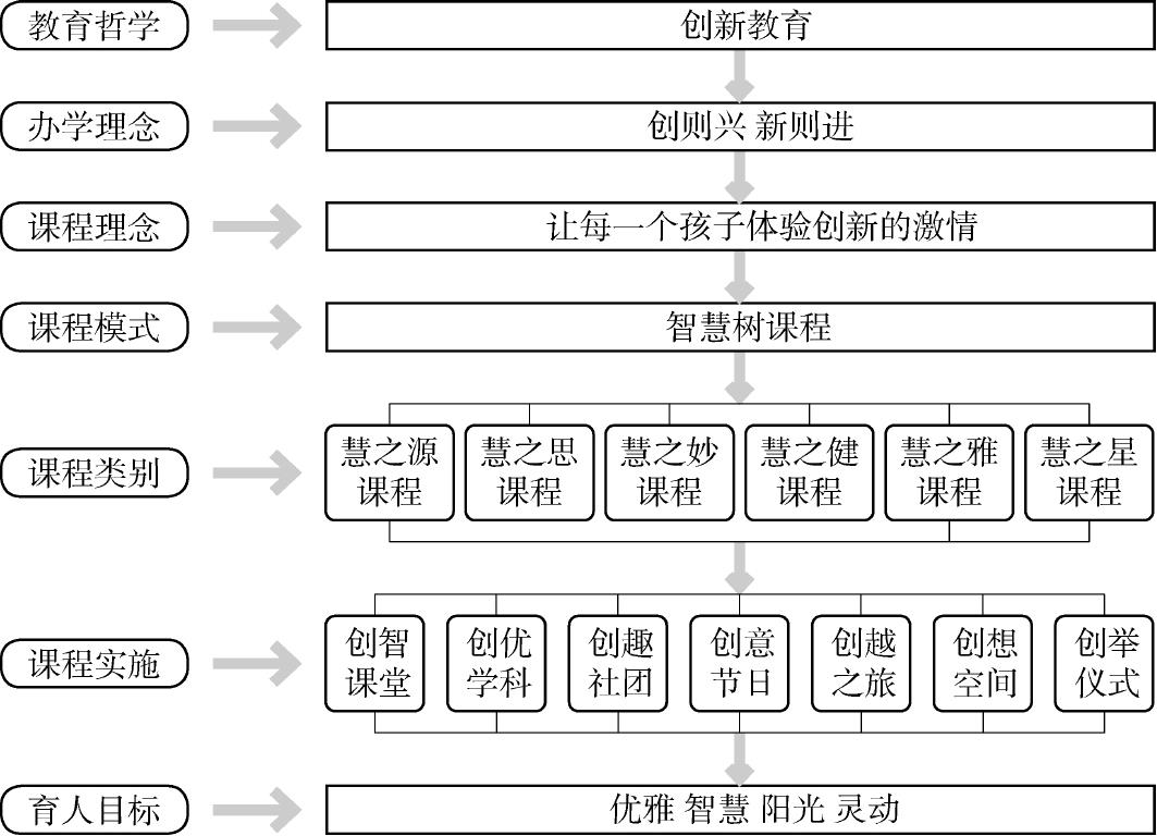 学校课程设计要为孩子指引明确的发展方向,要体现学校的实践历程。学校以教育哲学为方向,以“创则兴,新则进”的办学理念为宗旨,以“智慧树课程”为抓手,致力于培养“优雅、智慧、阳光、灵动”的创新学子,构建了学校课程体系(见图1)。