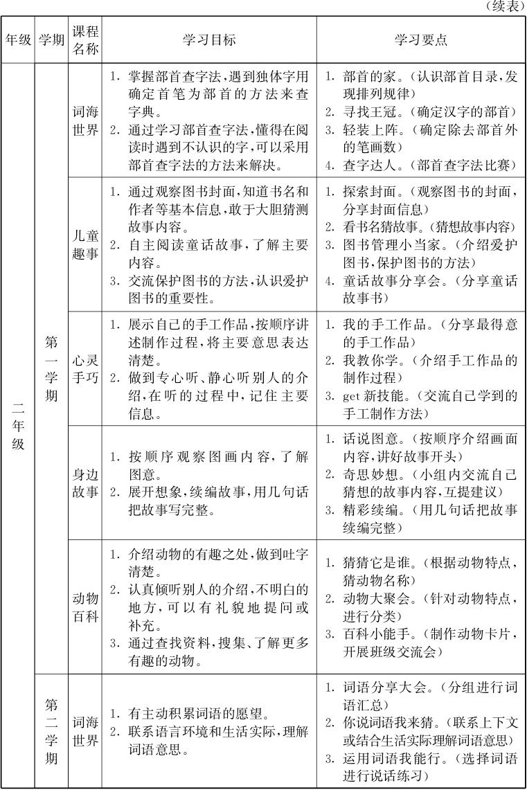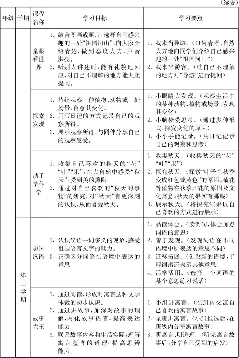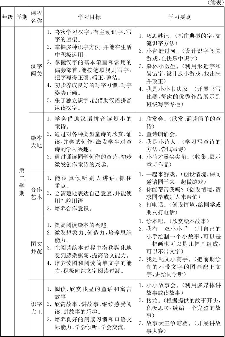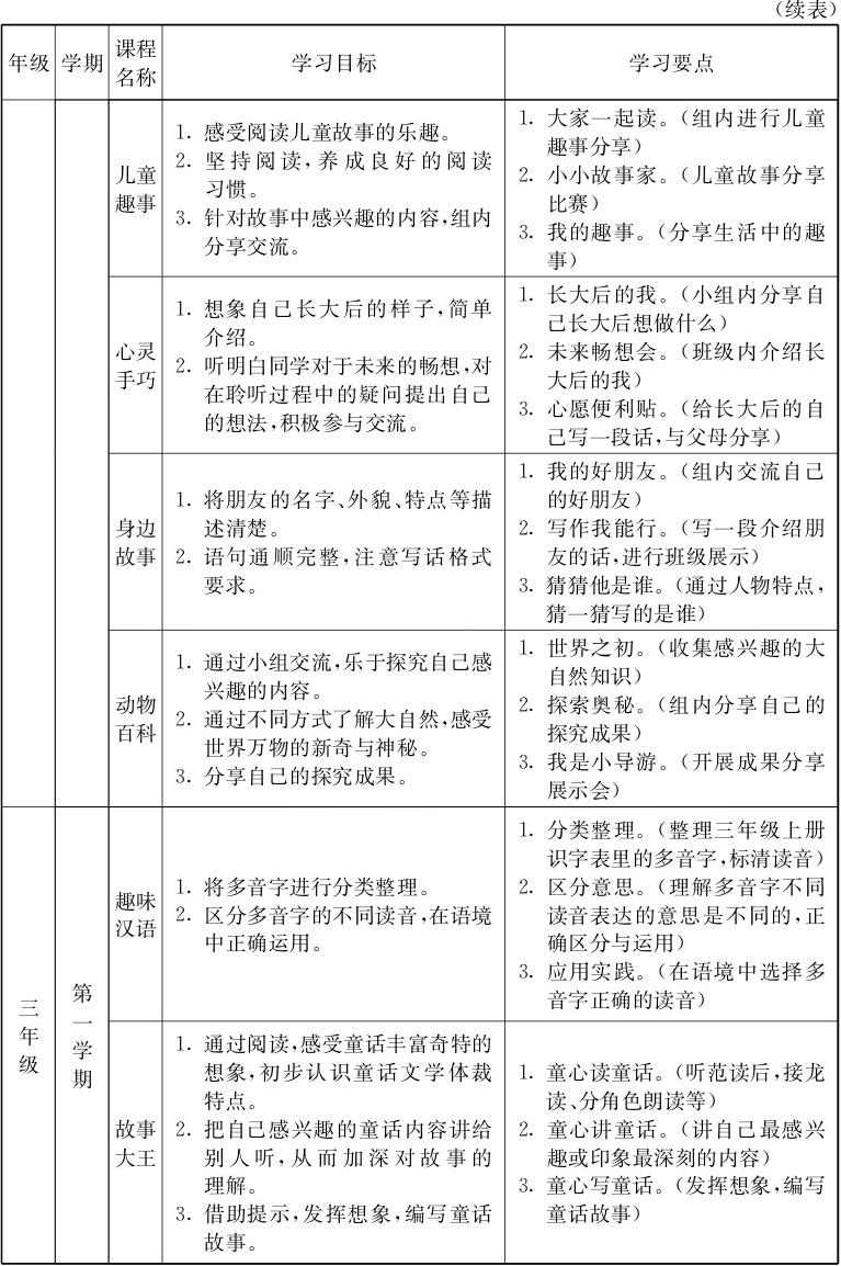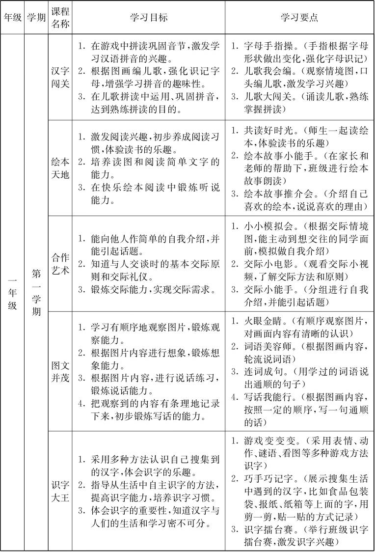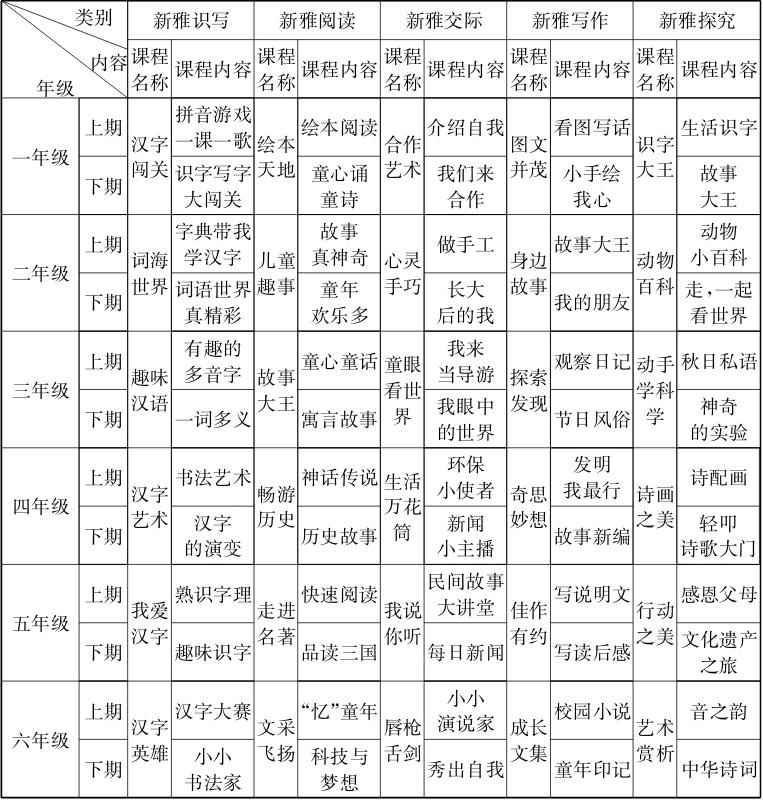 “新雅语文”为学生提供了丰富多样的课程内容,使学校课程体系更合理,学校特色更鲜明,具体课程目标及课程要点(见表1-3)。