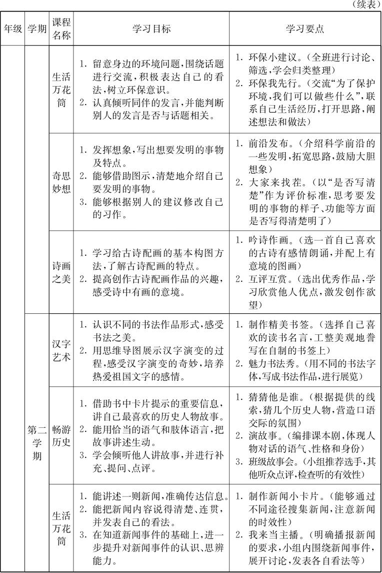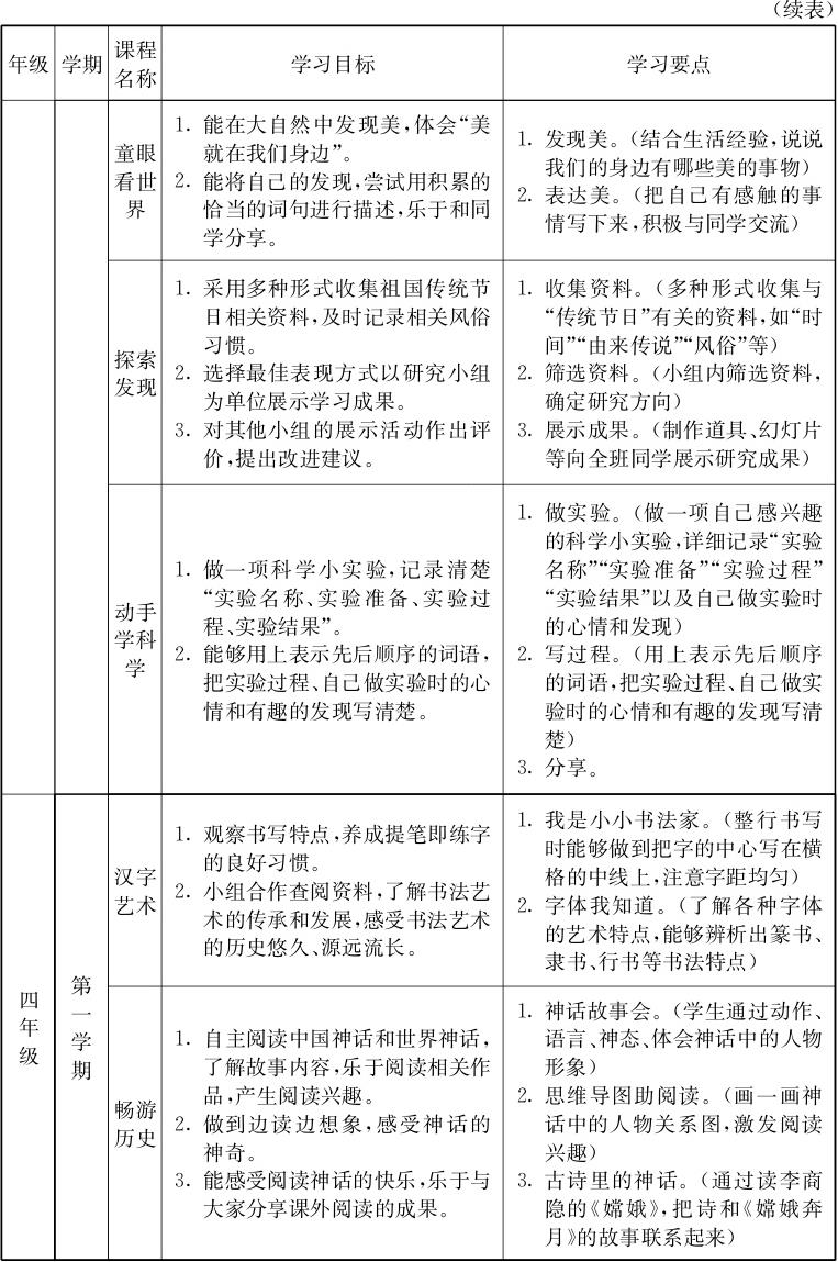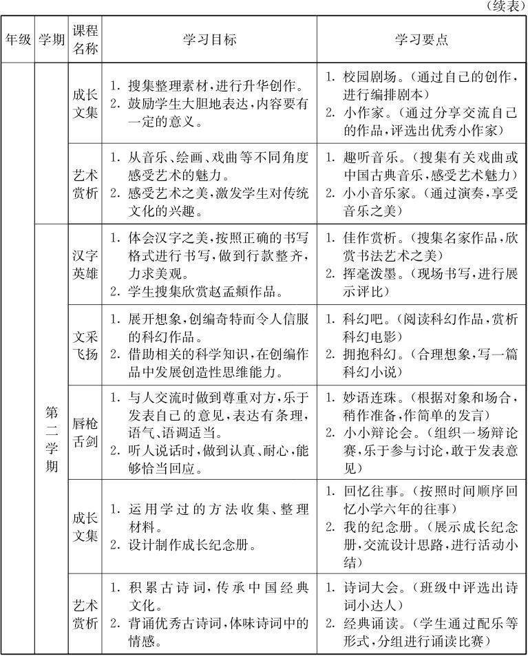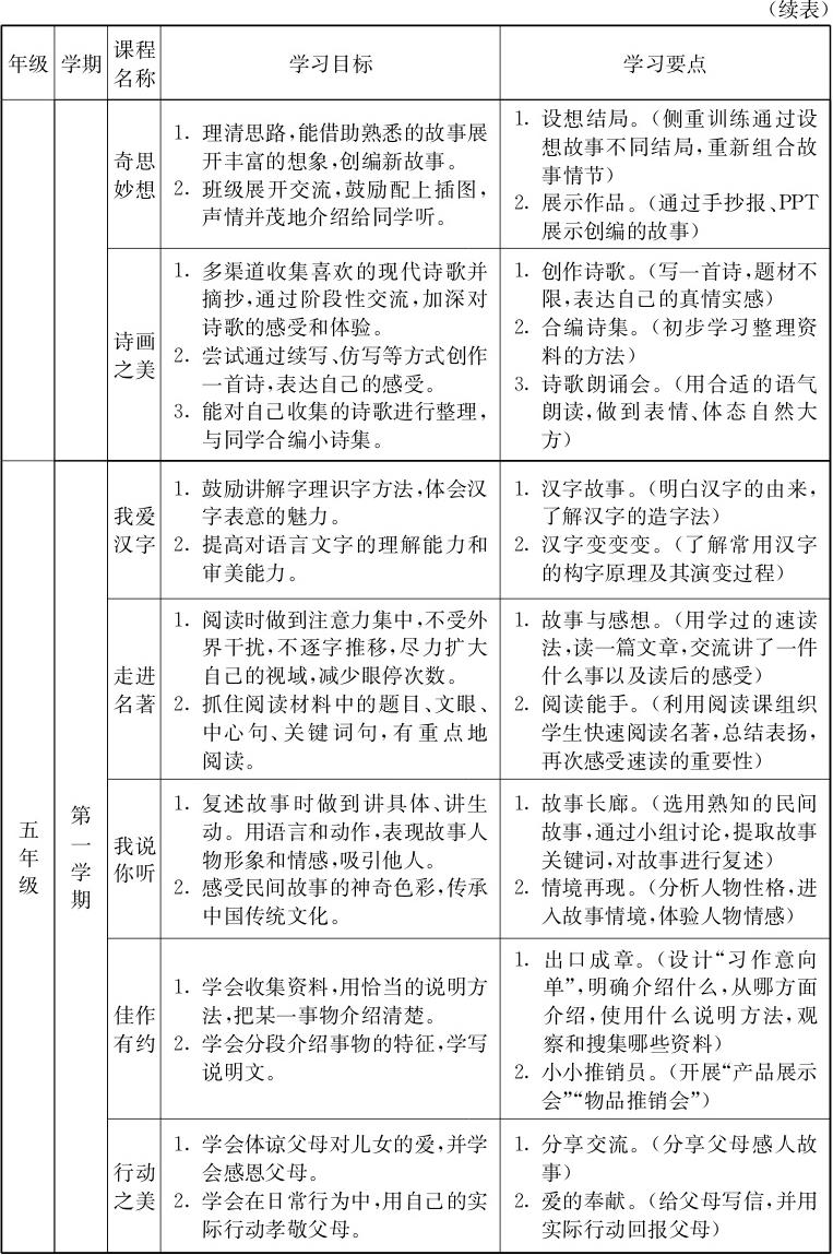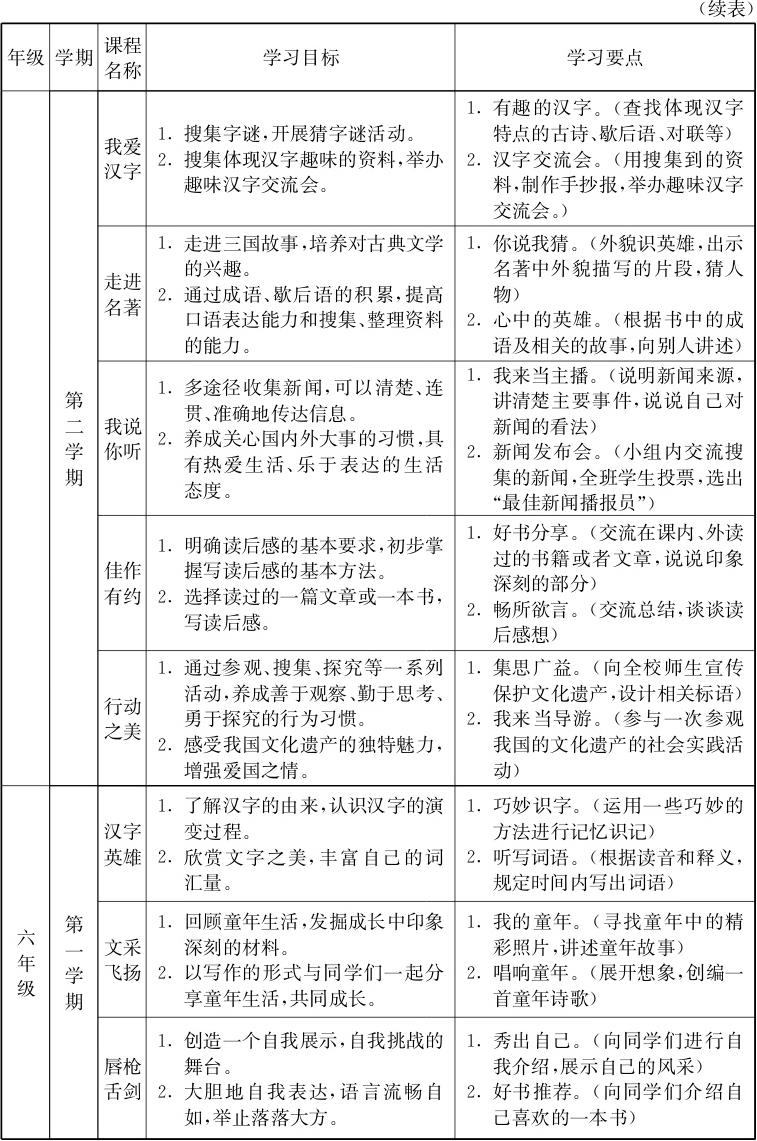 “新雅语文”为学生提供了丰富多样的课程内容,使学校课程体系更合理,学校特色更鲜明,具体课程目标及课程要点(见表1-3)。