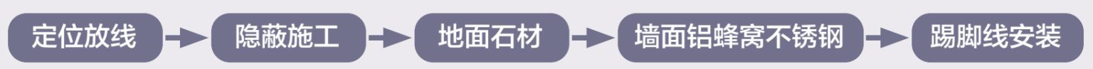 3.品控质检:墙面蜂窝不锈钢应把控整体墙面的平整度与分缝的均匀顺直;地面石材铺贴平整且无色差,石材密拼缝隙宽度不得大于1 mm;不锈钢踢脚线折边加工时应进行90°刨槽处理,安装顺直且拼接处无明显焊点。