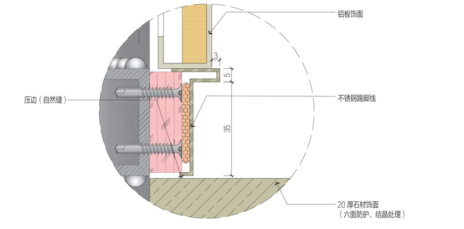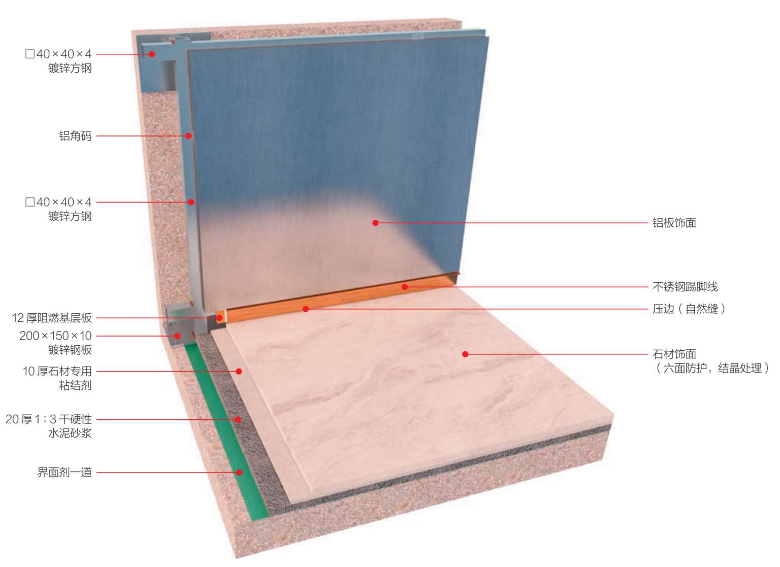 面层材料:铝板饰面、不锈钢踢脚线、20 mm厚石材饰面。