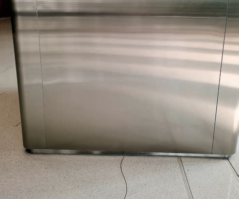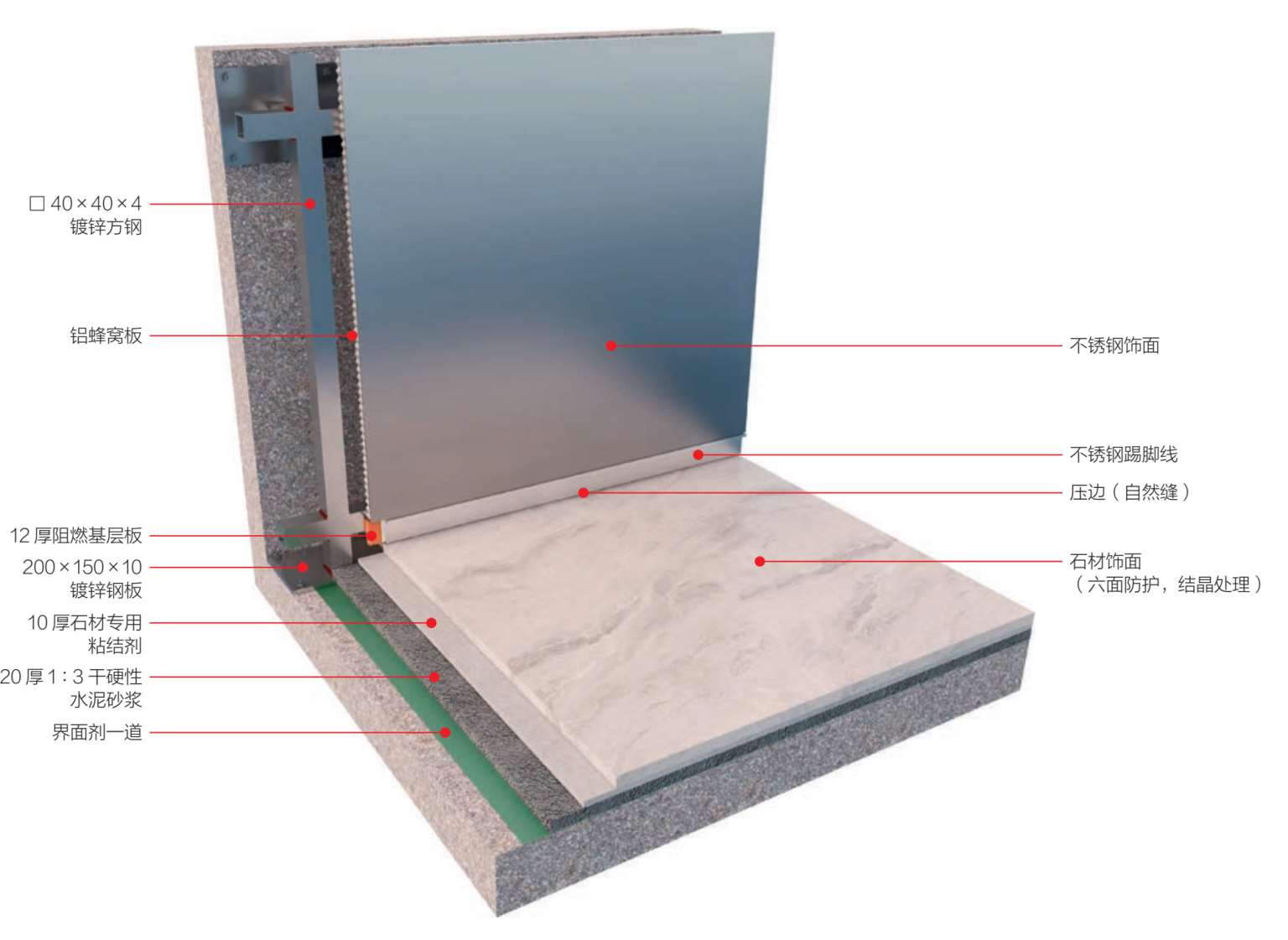 3.现场交底:交底内容包括完成面放线尺寸,收口节点大样,墙面蜂窝不锈钢、地面排板下单图等关键内容。不锈钢踢脚线基层板安装位置应合理,施工应平整、牢固,墙根处地面石材应延伸至踢脚线完成面10~20 mm,避免出现质量隐患。