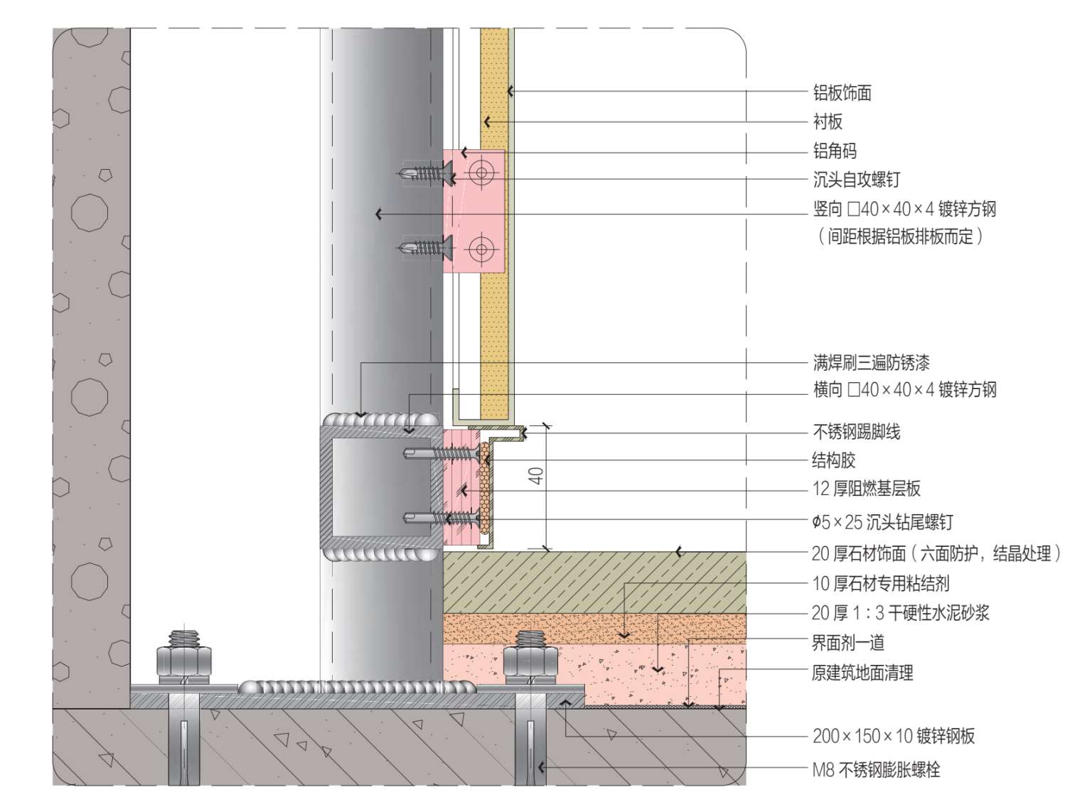 基层材料:阻燃基层板、□40 mm×40 mm×4 mm镀锌方钢、铝角码、石材专用粘结剂、200 mm× 150 mm×10 mm镀锌钢板、界面剂。