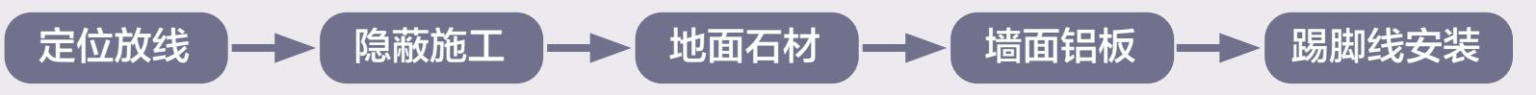 3.品控质检:墙面铝板、不锈钢饰面板应把控整体墙面的平整度与分缝的均匀顺直;地面石材铺贴平整且无色差,石材密拼缝隙宽度不得大于1 mm;不锈钢踢脚线折边加工时应进行90°刨槽处理,安装顺直且拼接处无明显焊点。