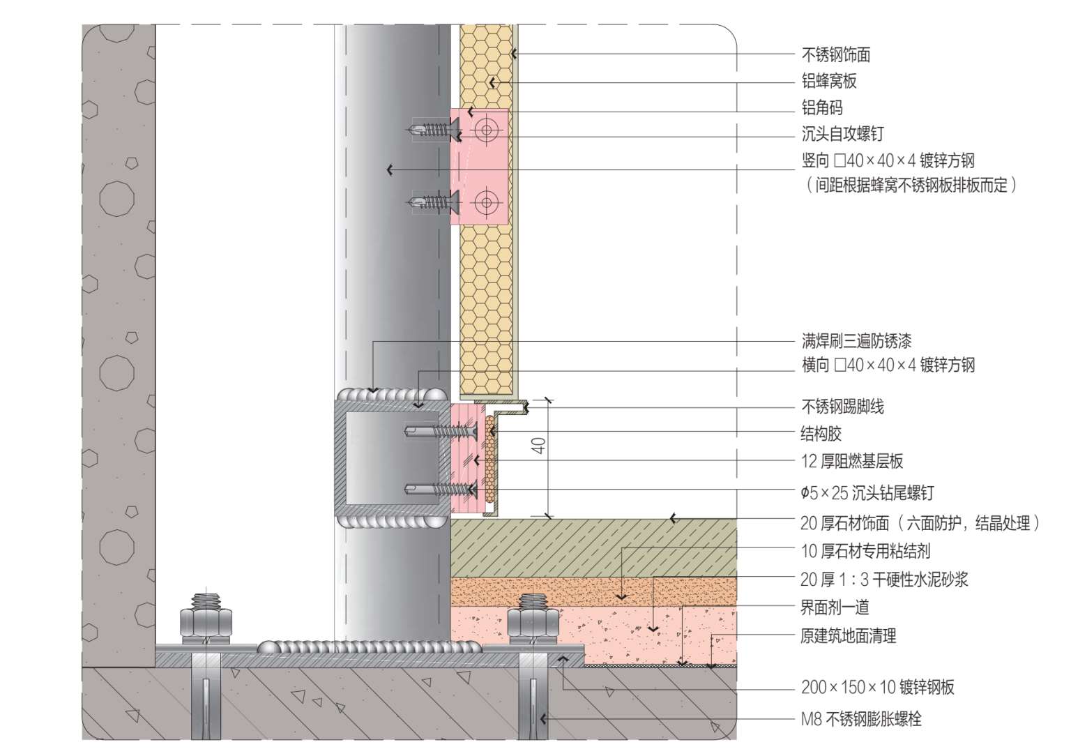 基层材料:铝蜂窝板、阻燃基层板、□40 mm×40 mm×4 mm镀锌方钢、铝角码、石材专用粘结剂、200 mm×150 mm×10 mm镀锌钢板、界面剂。