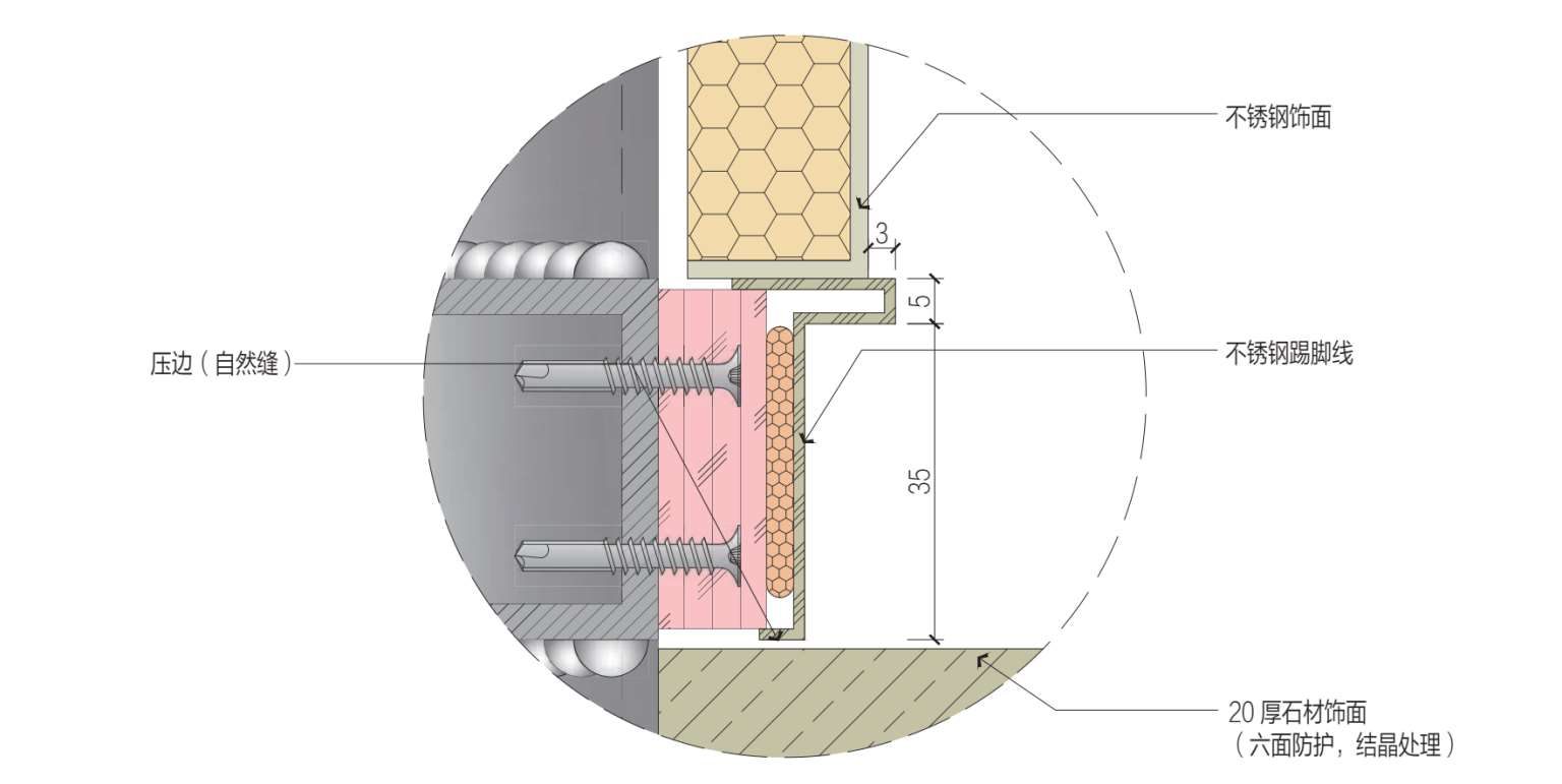 D 墙面蜂窝不锈钢、不锈钢踢脚线与地面石材压边工艺大样图