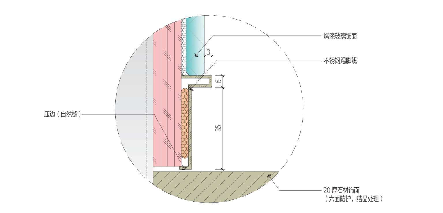 面层材料:烤漆玻璃饰面、不锈钢踢脚线、20 mm厚石材饰面。