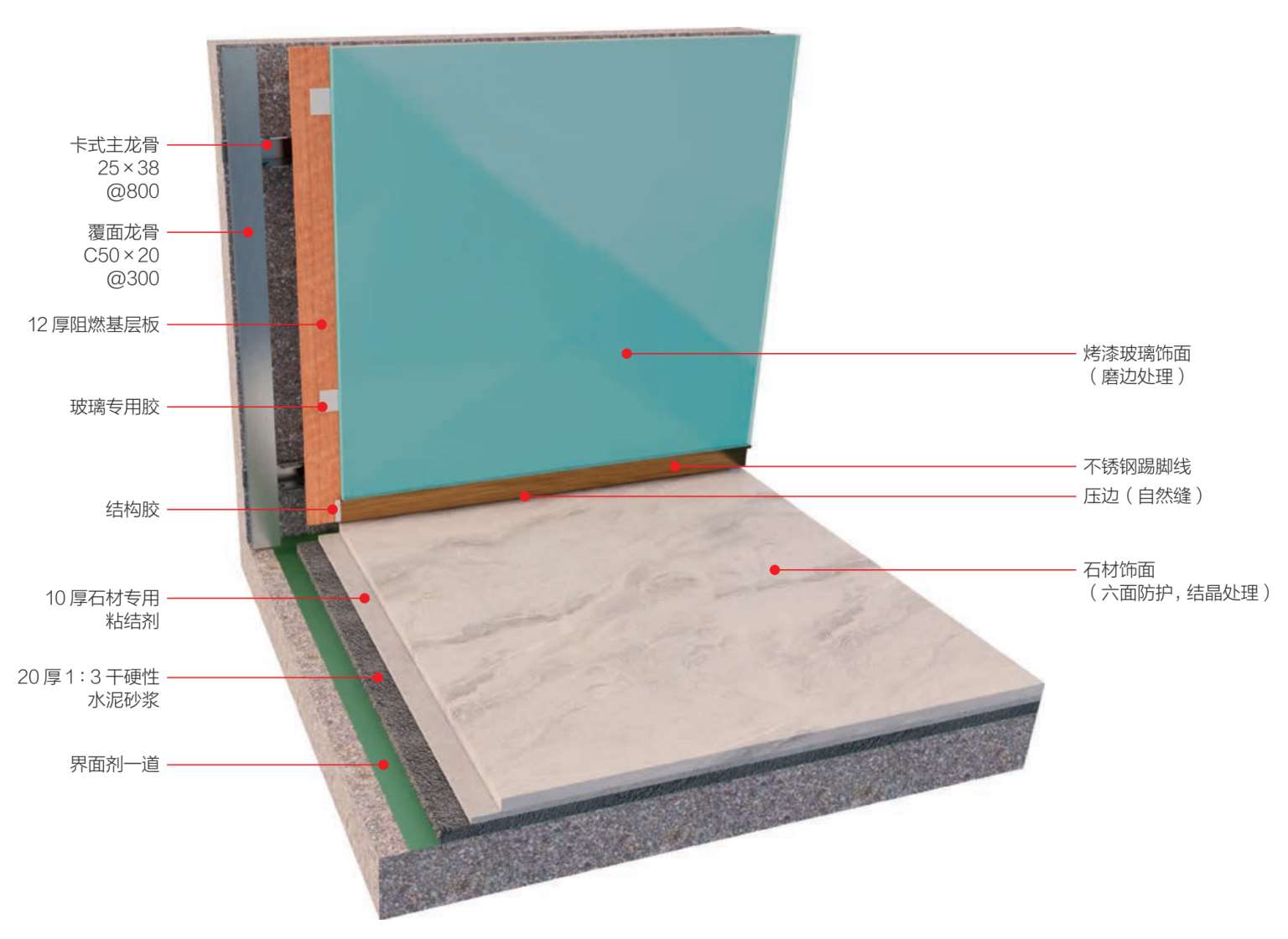基层材料:阻燃基层板、覆面龙骨C50×20 mm、卡式主龙骨25 mm×38 mm、石材专用粘结剂、界面剂、玻璃专用胶。