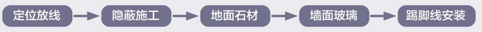 3.品控质检:墙面烤漆玻璃应把控整体墙面的平整度与分缝的均匀顺直;地面石材铺贴平整且无色差,石材密拼缝隙宽度不得大于1 mm;不锈钢踢脚线折边加工时应进行90°刨槽处理,安装顺直且拼接处无明显焊点。