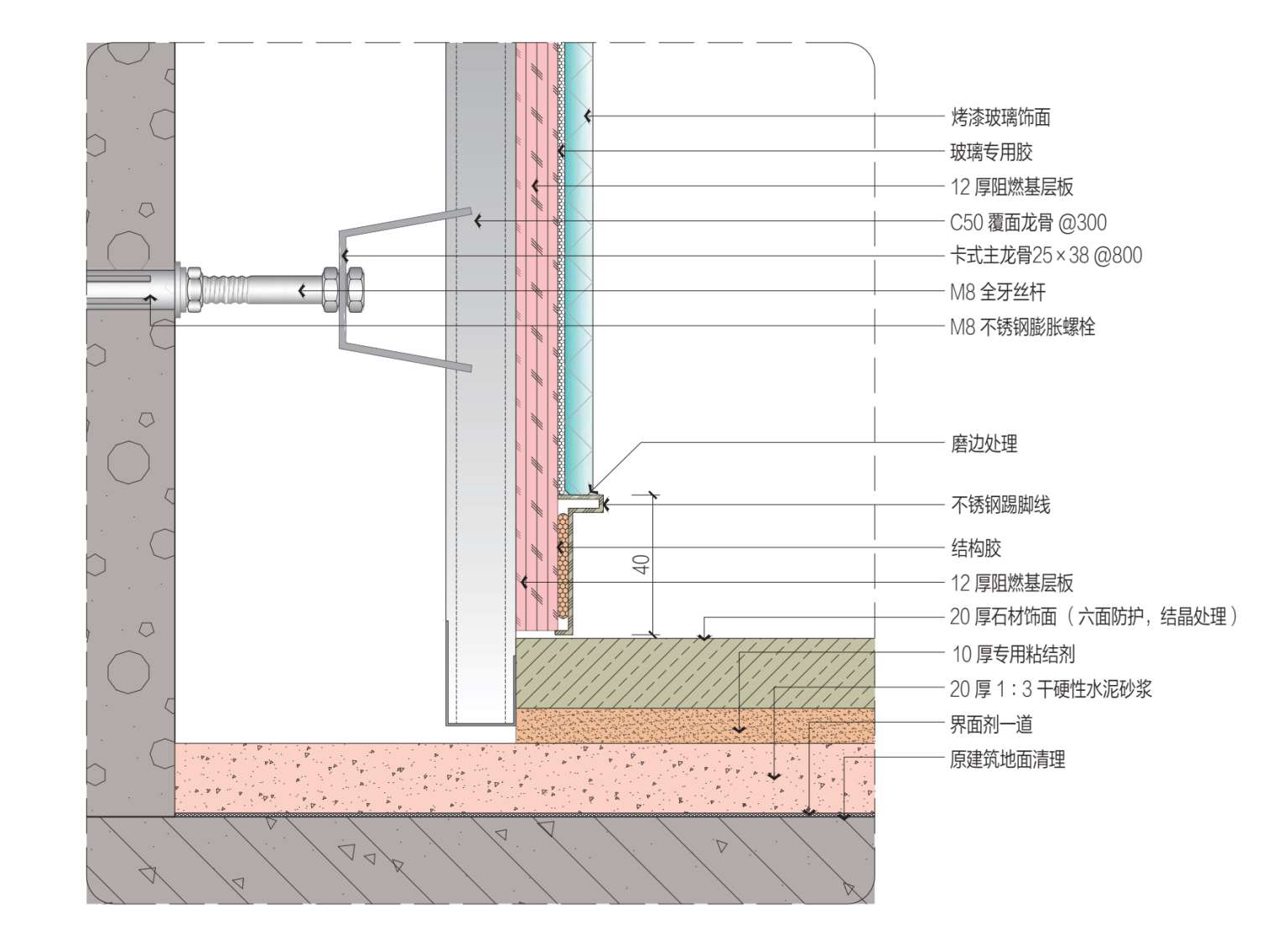 D 墙面烤漆玻璃、不锈钢踢脚线与地面石材压边工艺大样图