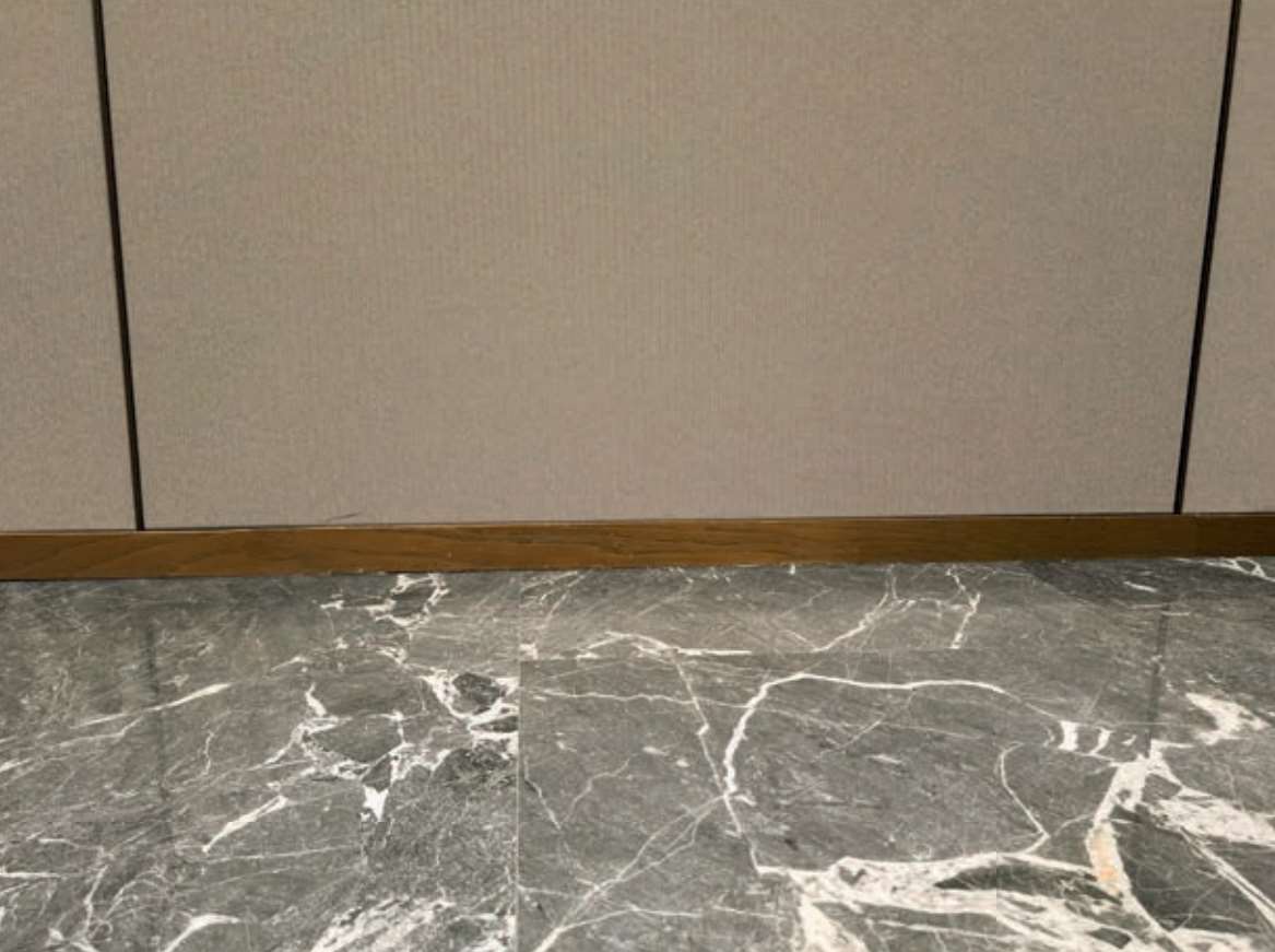 墙面硬包、不锈钢踢脚线与地面石材收口适用范围包括酒店、室内大厅、电梯厅、医院等墙面与地面的装饰。常见的收口方式为墙面压地面。这种工艺能够提升整体空间的品质和美观度,同时还能增强装饰效果,有很强的实用性。