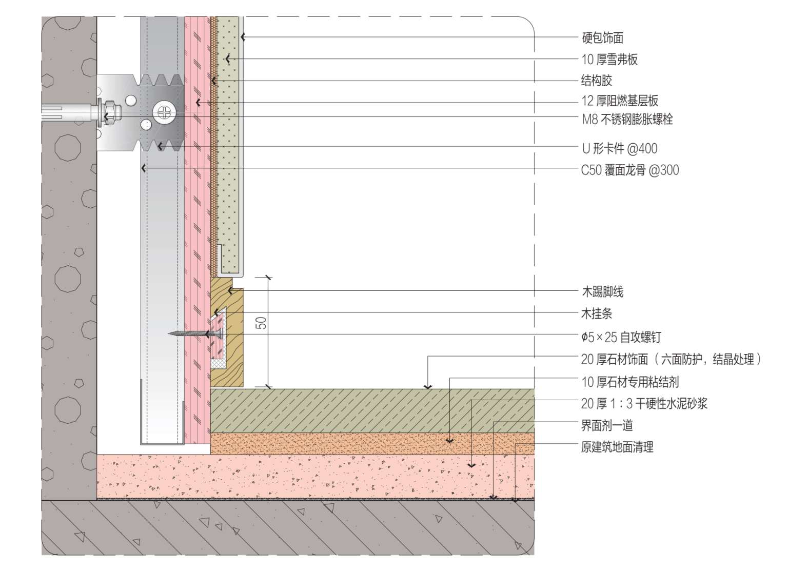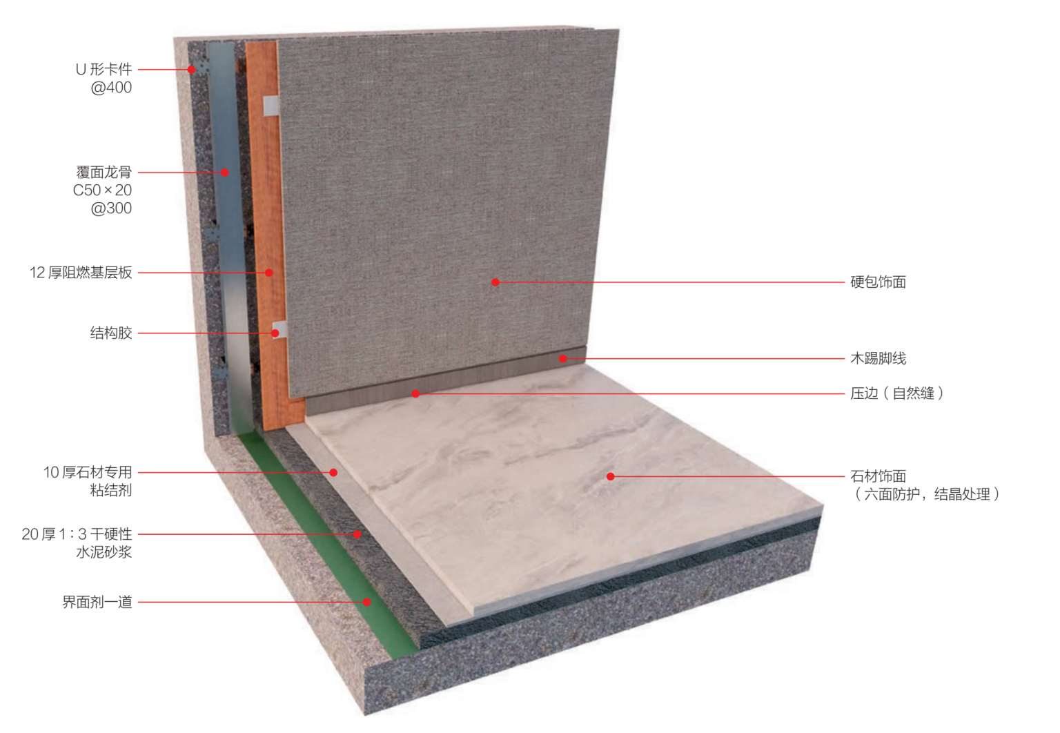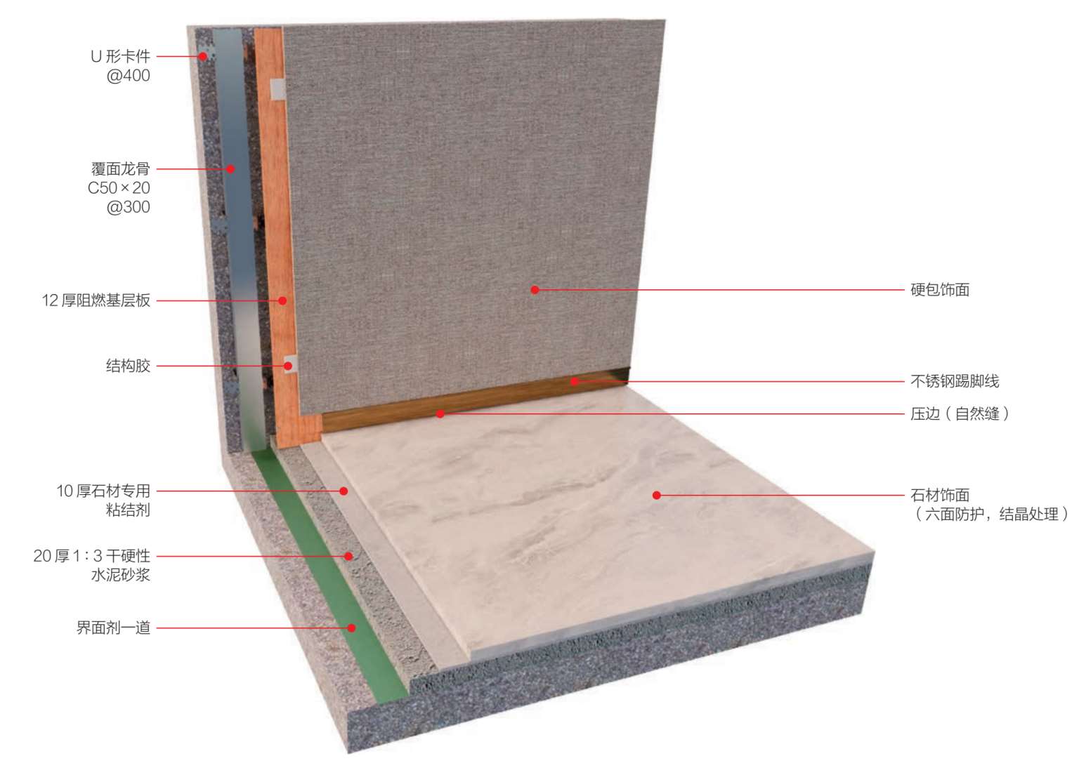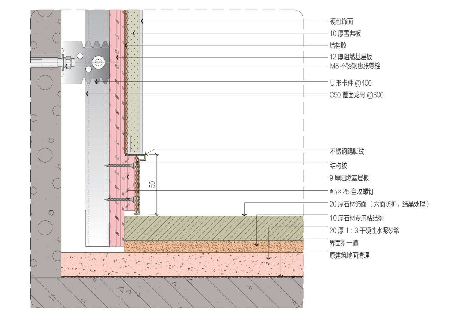 基层材料:阻燃基层板、覆面龙骨C50×20 mm、U形卡件、石材专用粘结剂、界面剂。