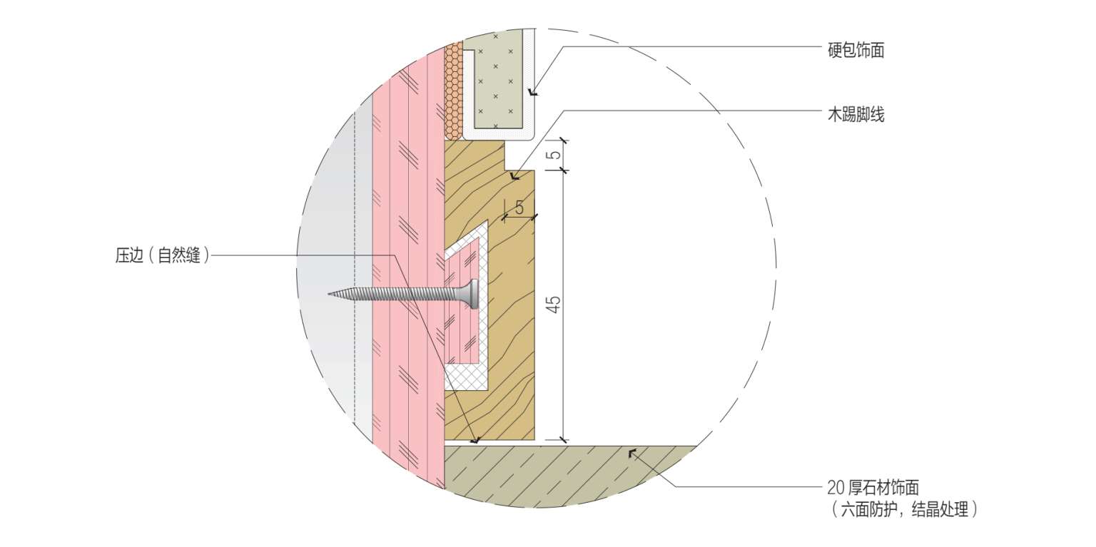 D 墙面硬包、木踢脚线与地面石材压边工艺大样图