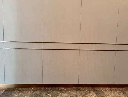 1.排板策划:墙面硬包排板下单时应结合硬包常规尺寸合理深化排板图,减少硬包背板定制的风险。不锈钢踢脚线分割拼接缝与墙面硬包、地面石材对缝时,应按最大倍数尺寸进行加工。