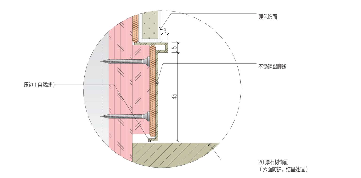 面层材料:硬包饰面、不锈钢踢脚线、20 mm厚石材饰面。