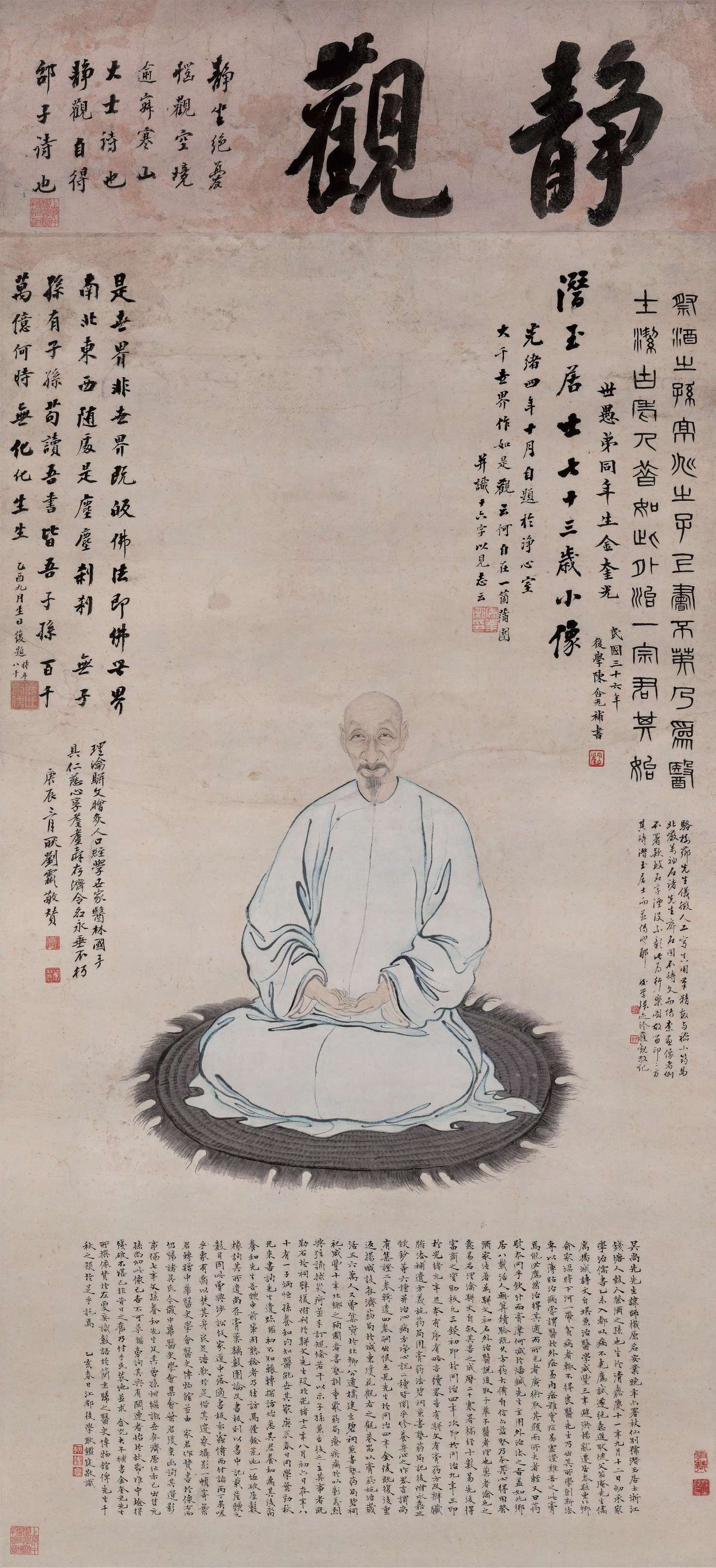 · 款识:潜玉居士七十三岁小像。光绪四年十月自题于净心室:大千世界作如是观云何自在一个蒲团,并识十六字以见志云。