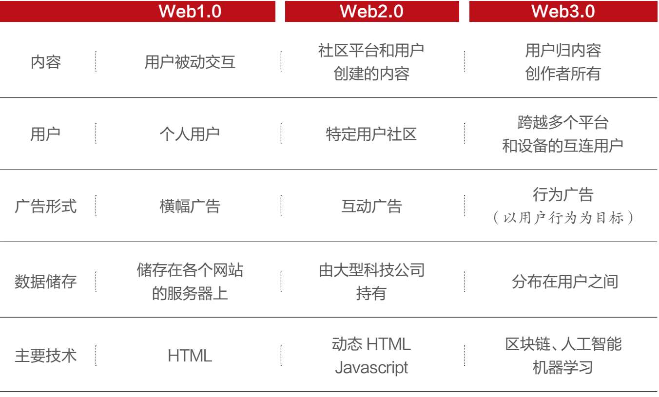 既然要讲Web3.0,就要简单过一下1.0 和 2.0。Web3.0 和Web1.0、Web2.0的区别,请看下图: