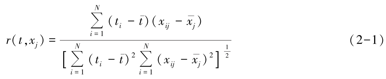 将所有特征逐个对目标值作二维图,计算目标值 t 与特征 x j 之间的相关系数,见式(2-1)。