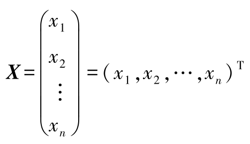 如果一个对象的特征观察值为{ x 1 , x 2 ,…, x n },它可构成一个 n 维的特征向量 X ,即 X =( x 1 , x 2 ,…, x n ) T ,式中,“ x 1 , x 2 ,…, x n ”为特征向量 X 的各个分量。一个模式可以看作 n 维空间中的向量或点,此空间称为模式的特征空间 R n 。在模式识别过程中,要对许多具体对象进行测量,以获得更多观测值。其中有均值、方差、协方差与协方差矩阵等。