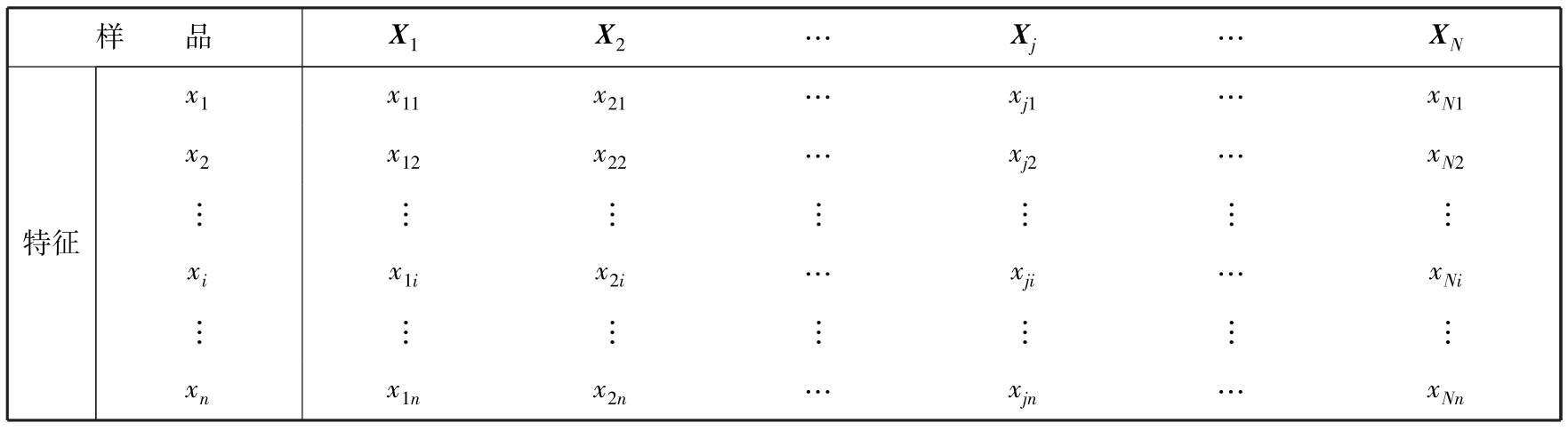 若有一批样本共有 N 个,每个样本有 n 个特征,这些数值可以构成一个 n 行 N 列的矩阵,称为原始资料矩阵,见表1-1。
