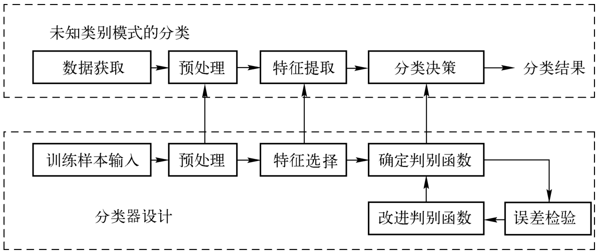 典型的模式识别系统如图1-1所示,由数据获取、预处理、特征提取、分类决策及分类器设计五部分组成。一般分为上下两部分,上部分完成未知类别模式的分类;下部分属于分类器设计,利用样本进行训练,确定分类器的具体参数,从而完成分类器的设计。而分类决策在识别过程中起的作用是对待识别的样本进行分类决策。