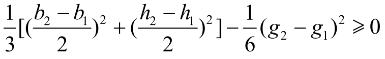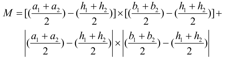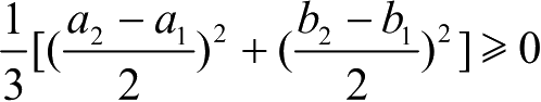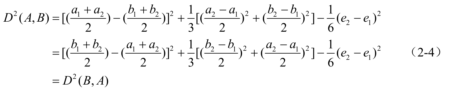 假设两区间分别为 A =[ a 1 , a 2 ], B =[ b 1 , b 2 ],其中, a 1 、 a 2 、 b 1 、 b 2 均为实数,则区间 A 和区间 B 之间的距离 D ( A , B )为: