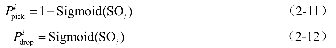 概率转换函数 将客户需求群相似度转化为个体移动待聚类需求物元 S i “拾起”或“放下”物体的概率函数。“拾起”概率 P pick 与“放下”概率 P drop 分别为: