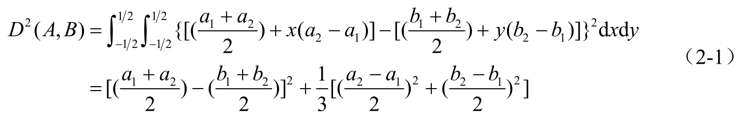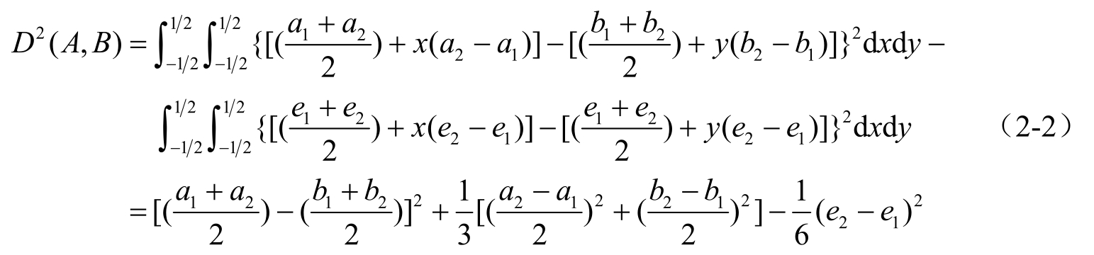 对任意两区间 A =[ a 1 , a 2 ], B =[ b 1 , b 2 ],且 A ∩ B = E =[ e 1 , e 2 ],其中, a 1 、 a 2 、 b 1 、 b 2 、 e 1 、 e 2 均为实数,则区间 A 和区间 B 之间的距离 D ( A , B )为: