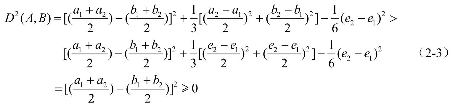 以上分析过程证明,式(2-1)满足度量空间的距离定义条件,可作为区间距离的度量公式。