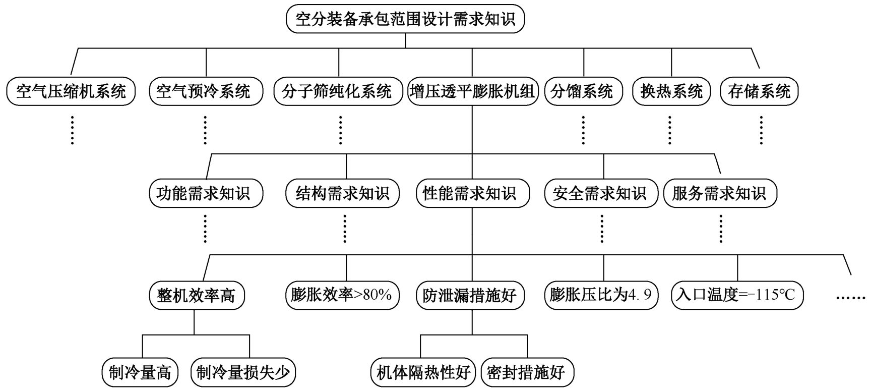 在产品需求知识本体表达与多粒度分解的基础上即可对需求知识进行多粒度重组建模,形成最终的产品需求知识拓扑重组模型。对于产品需求知识拓扑重组模型的构建一方面要考虑到需求知识粒度的层次性,另一方面也要考虑到产品功能和结构的层次特点。例如对于大型空分装备产品需求知识的拓扑重组建模,空分装备承包范围需求知识用于描述用户的总体需求知识,其子节点需求知识包括对空气压缩机系统、空气遇冷系统、分子筛纯化系统、增压透平膨胀机组、分馏系统、换热系统、存储系统等子系统的产品设计需求。上述各项需求知识属于同一粒度需求知识,而且分别包含各自的子节点,如增压透平膨胀机组子系统又可分为功能需求知识、结构需求知识、性能需求知识、安全需求知识、服务需求知识等。对上述粒度层次下的需求知识又可按照上节提出的分解准则进行本体式多粒度分解,不同粒度的需求知识共同组成空分装备产品的需求知识拓扑重组模型,如图3-2所示为空分装备产品的需求知识本体的多粒度拓扑重组模型。