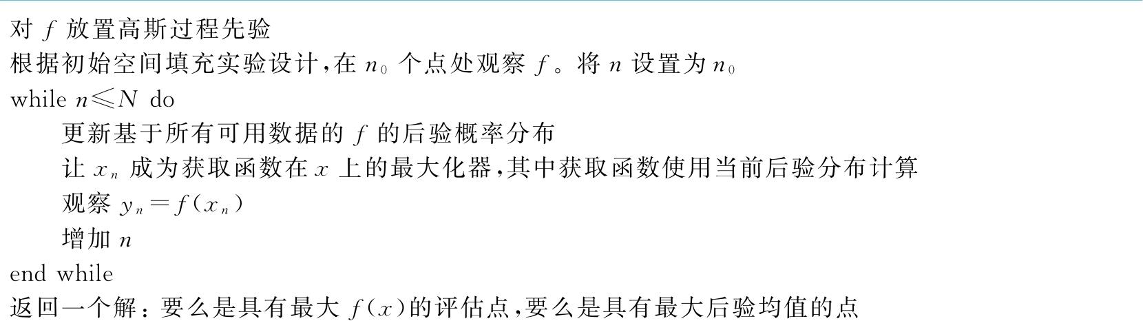 贝叶斯优化由两个主要部分组成:用于建模目标函数的贝叶斯统计模型,以及用于决定下一次采样位置的获取函数。在根据初始空间填充实验设计进行目标函数评估后,通常由均匀随机选择的点组成,它们被迭代地用于分配剩余的 N 个函数评估预算,如算法2.1所示。