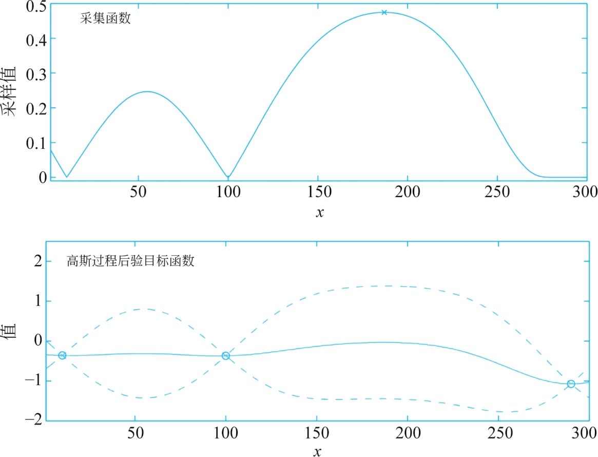 底部面板显示了与此后验对应的期望改进获取函数。请注意,它在先前评估过的点处取值为0。当目标函数的评估是无噪声时,这是合理的,因为在这些点处进行评估对求解式(2-1)提供不了有用的信息。还请注意,它倾向于在具有更大的置信区间的点上取得更大的值,因为在观察到对目标函数更加不确定的点时,更容易找到较好的全局近似最优解。此外,它倾向于在具有较大后验均值的点上取得更大的值,因为这些点往往靠近较好的全局近似最优解。