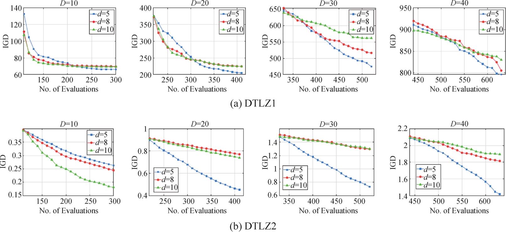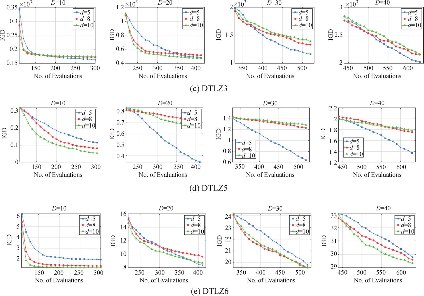 图5.8 d ={5,8,10}时,Block-MOBO在DTLZ1-3和DTLZ5-6上运行30次的IGD均值随迭代次数变化的趋势