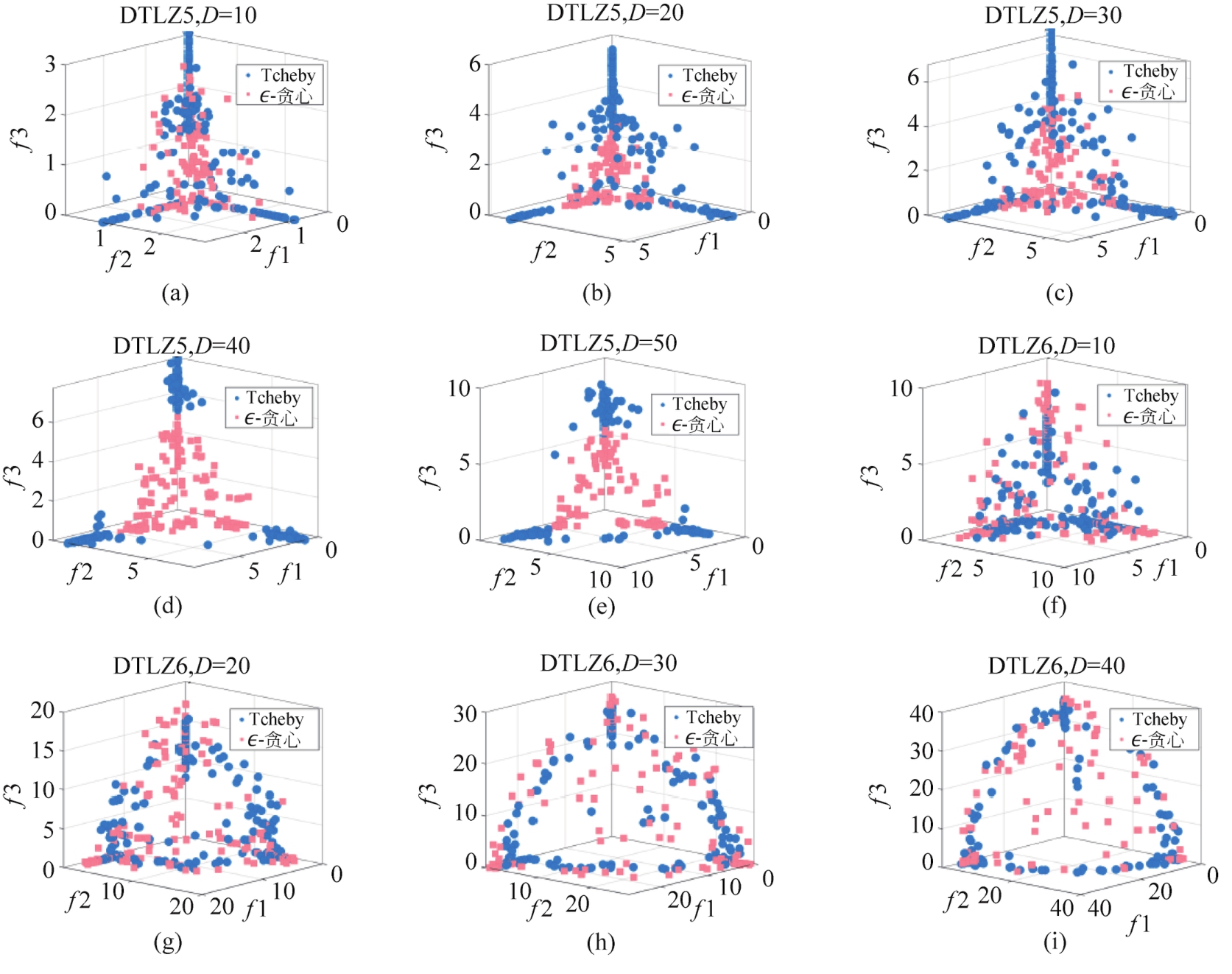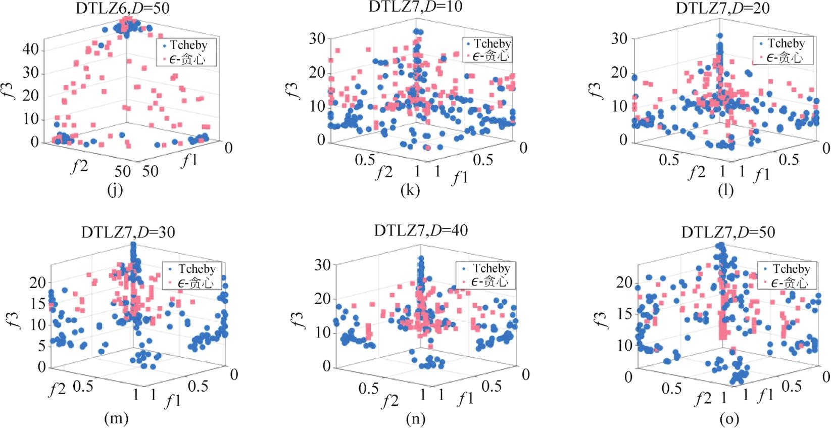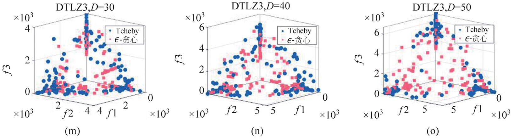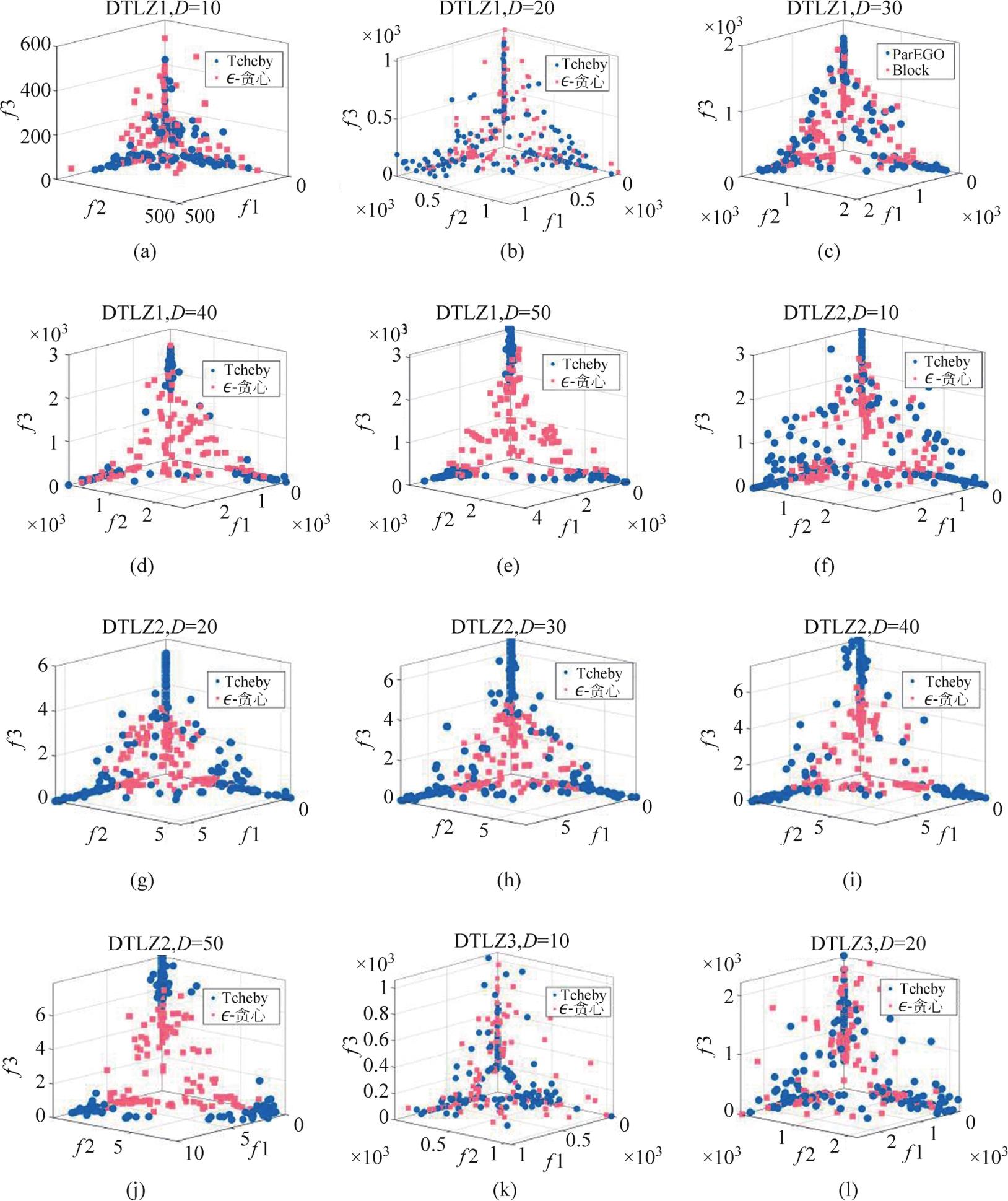 图5.6 基于增广切比雪夫函数的获取函数和 ∈ -贪心获取函数在DTLZ1-3上获得的200个最终候选解
